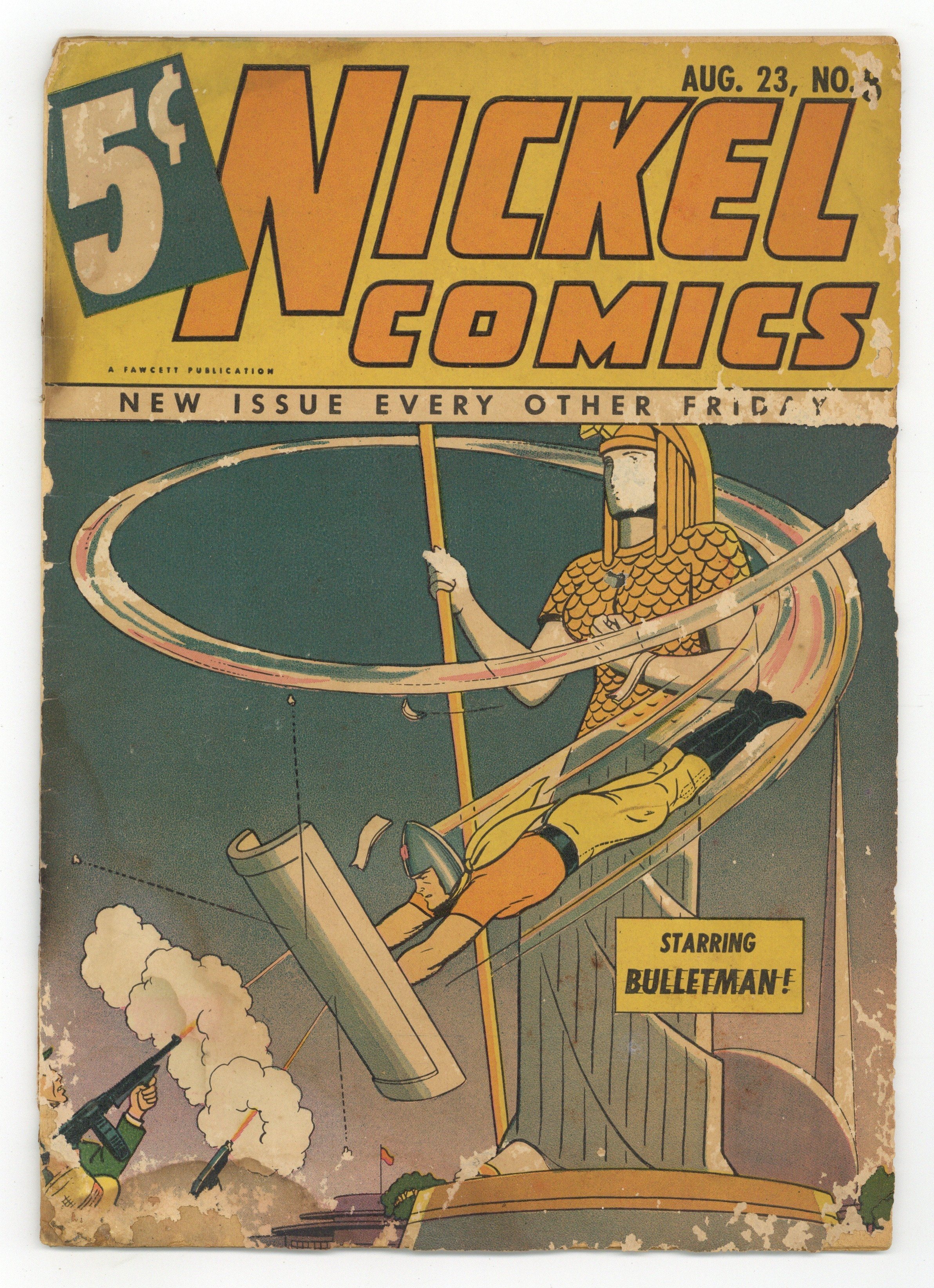 Cover by Jack Binder. Stories and art by Bill Parker, Ed Smalle, Rafael Astarita, Gus Ricca and Harry Anderson. Nickel Comics was an experiment by Fawcett - half as thick as their typical comics, costing half as much, and coming out twice as often. Bulletman investigates sabotage at the State Fair. Red Gaucho dares to enter the Domain of Don Bacco, in his final appearance before moving to Master Comics, with the rest of the Nickel Comics lineup. Captain Venture faces the Gonga Invaders, in a story with some groovy, otherworldly Basil Wolverton-style art by Rafael Astarita. Bulletman; White Rajah; Hot Ice; Jim Dolan; Captain Venture and the Planet Princess; Red Gaucho: The Domain of Don Bacco. Final issue of the series. 32 pages, Full Color. Cover price $0.05.