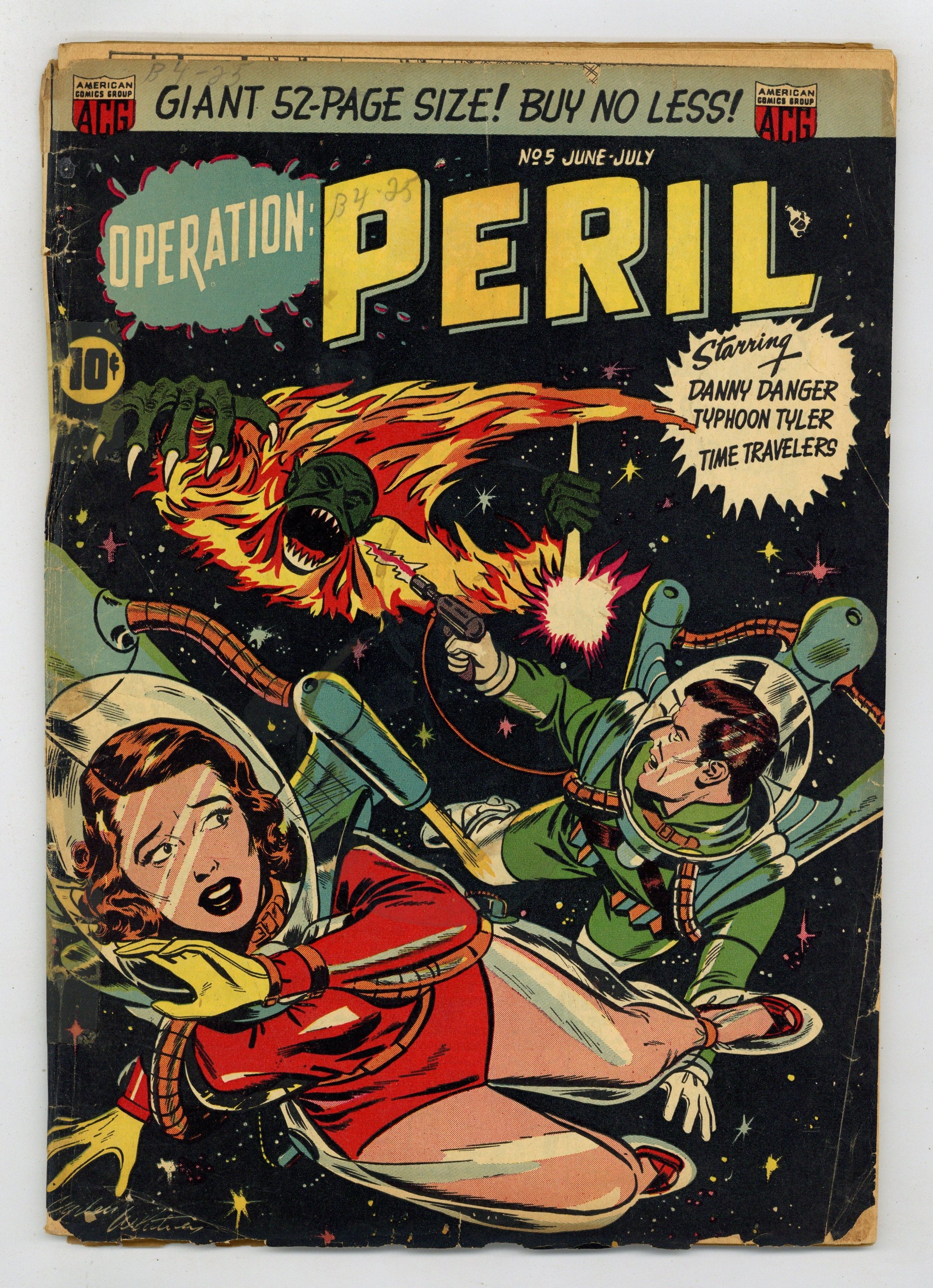 Cover by Ogden Whitney. Edited by Richard E. Hughes. Stories by Richard Hughes. Art by Ogden Whitney, Ken Bald, and Leonard Starr. Tales of adventure and science fiction from legendary early independent comics publisher ACG. Tom and Peggy travel to 1720 and meet the pirate queen Anne Bonney; Danny Danger gets involved with crooked fight promoters and a plot to impersonate a masked wrestler; The true tale of when President Andrew Jackson became involved in a fatal duel over a horse race. Another terrific Ogden Whitney sci-fi cover. Danny Danger; Louisiana Firecracker; Typhoon Tyler; Operation: Dynamite!; Time Travelers; Blinding Gold; Jackson's Duel! 52 pages, Full Color. Cover price $0.10.