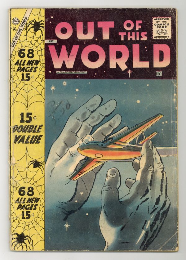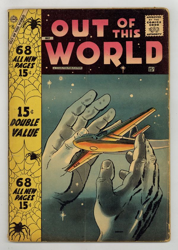 Cover by Maurice Whitman. Stories and art by Steve Ditko, Dick Malmgren, Rocke Mastroserio, Bill Molno, Charles Nicholas, Vince Alascia, Fred Kida, and Sal Trapani. Charlton responds to the new Comics Code with kid-friendly tales of science fiction, often illustrated by Steve Ditko or other future comics legends. A young boy sees a very different world than the people around him do, in one of several stories in his issue with art by Spider-Man co-creator Steve Ditko. In another Ditko story, Commander Dalles, Interplanetary Security Officer, figures out "The Secret Of Captain X." A Nazi officer pretends to surrender to Allied forces, hoping he can assassinate a high-ranking Allied official. The New Oddity; The Fingerprint; Emergency Landing; Imagination; Big Brainstorm; The Secret of Capt. X; At Last My Eyes Have Opened; Dog Whistle; And the Building Fell, Too; It Could Be Dangerous; Ludwigs Trolley; Phantom Cargo; P.O.W. 68 pages, Full Color. Cover price $0.15.