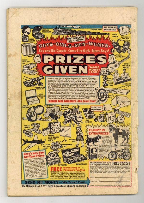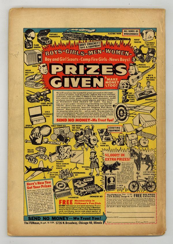 Published May 1958 by Charlton Comics Group.$34.00- 1.75" Cumulative spine split. Cover glued to first wrap. Cover and first wrap detached.