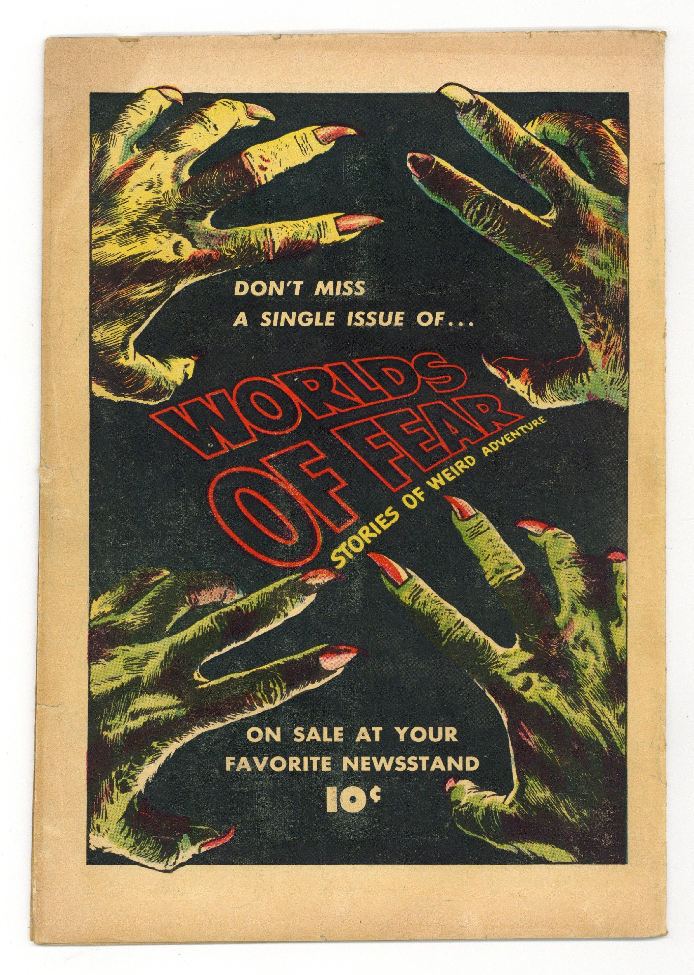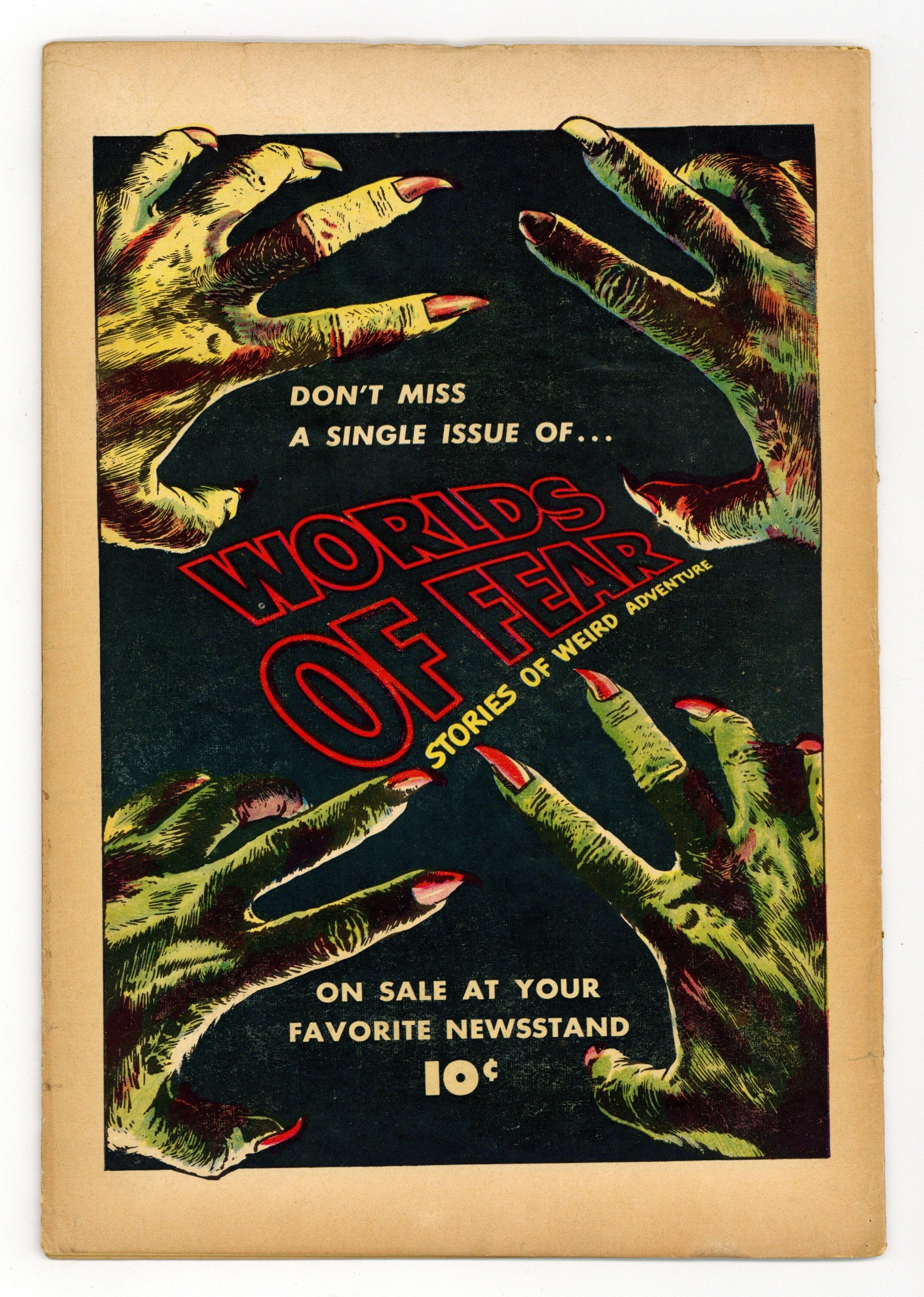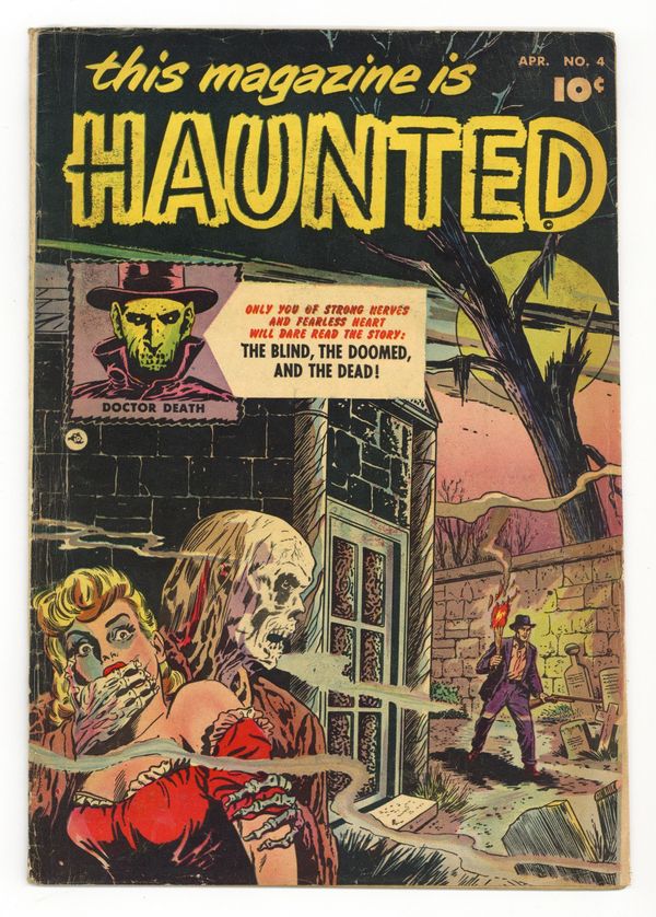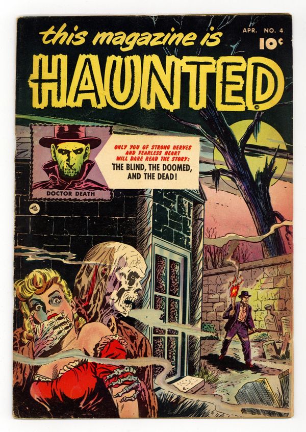 Edited by Will Lieberson, Roy Ald and Al Jetter. Cover by Shelly Moldoff. Stories by unknown. Art by Bernard Baily, Bob Powell and unknown. Only you of strong nerves and fearless heart will dare read this issue! Horror tales that are so scary they could only lead you to believe that This Magazine is Haunted! In this issue: Justin Westrum murders his business partner Mack and disposes of his body in a nearby lake. But he is haunted by Mack's curse who swore to "keep an eye" on him. Becoming more and more paranoid, Westrum goes too far in his attempts to cover his tracks in "The Constant Eye" with art by Bernard Baily. Plus: Attending a seance, Warren Travers' soul is pulled out of his body and wanders the realms of the beyond. Meanwhile, an otherworldly creatures inhabits his body and tries to build a machine that will call all the lost souls into this world in "Seance of Terror!" And: A carnival owner tries to buy out the proprietor of the wax museum. When the latter refuses, he is killed, but returns to drag his murderer before a ghostly tribunal. The sentence is death in "The Blind, the Doomed -- and the Dead!" with pencils by Bob Powell. Also: 2-page text story "Revenge in the Clouds" written by Daniel Sheldon, and an ad for Worlds of Fear. 36 Pages, Full Color. Cover price $0.10.
