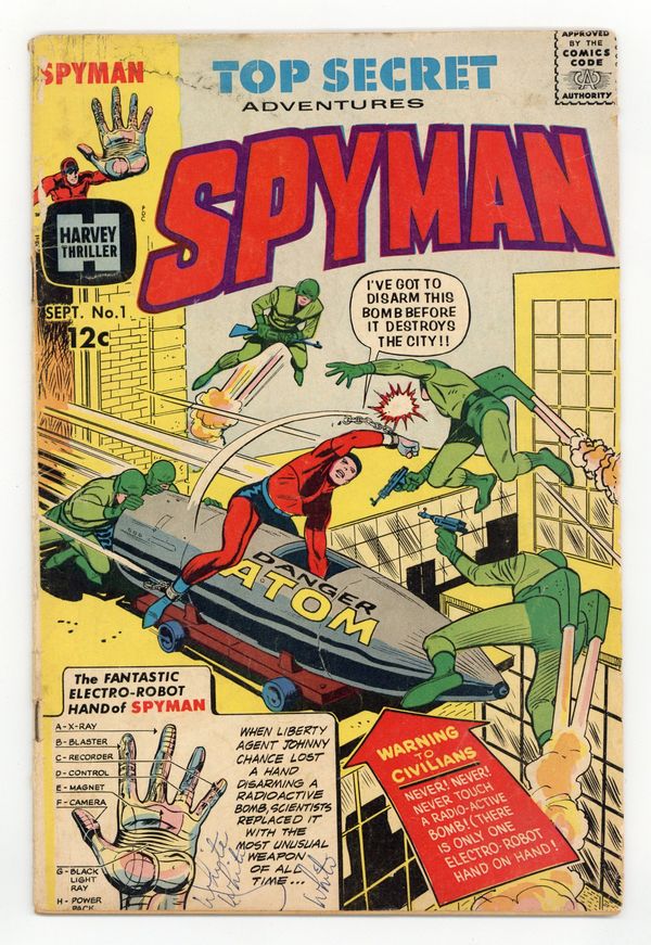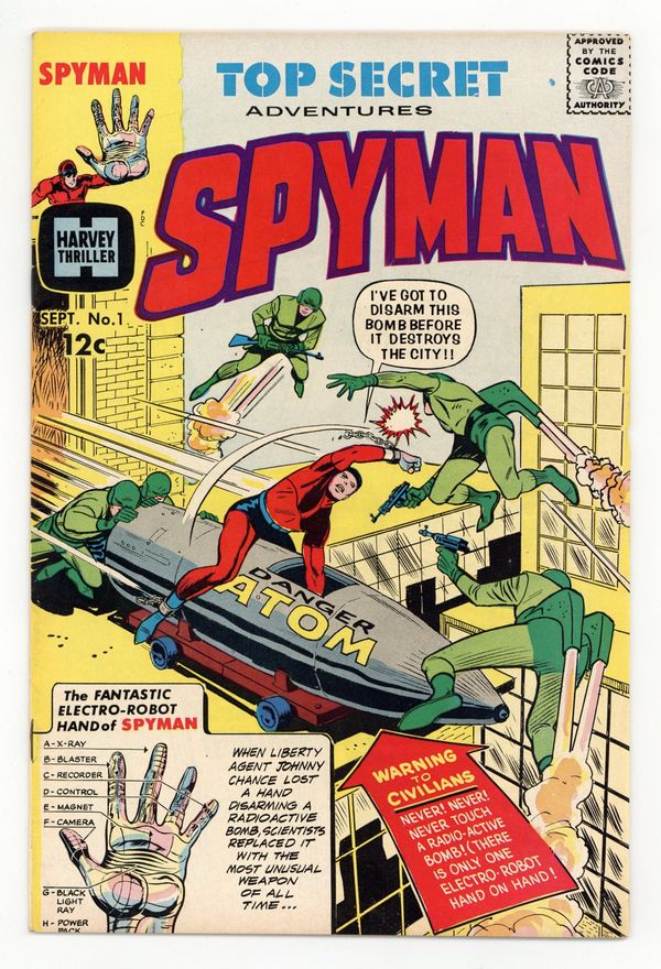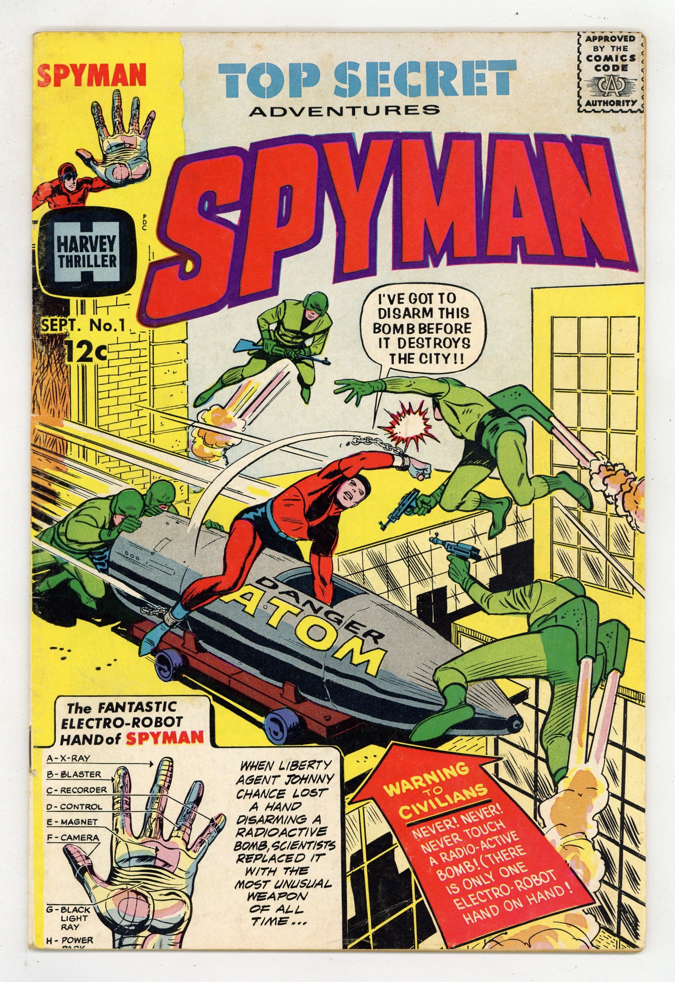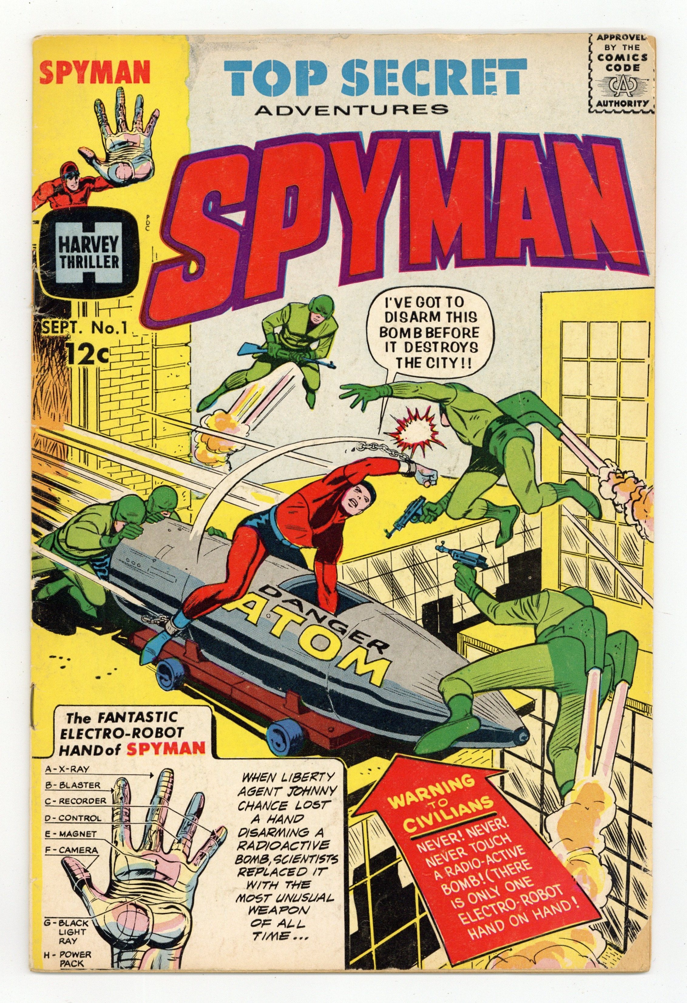 Starts Jan 3 Origin and first appearance of Spyman in "The Birth of a Hero," plus "Spyman at the Mercy of the Whisperer" and "How to Unmask a Villain." Art by George Tuska and Reed Crandall (inks). Jim Steranko splash page pencils (first pro work). 1 page Goodyear Aerospace ad drawn by Neal Adams. Rocky and Bullwinkle star in a one-page Cheerios ad. Tuska cover. 36 pages, full color. Cover price $0.12.