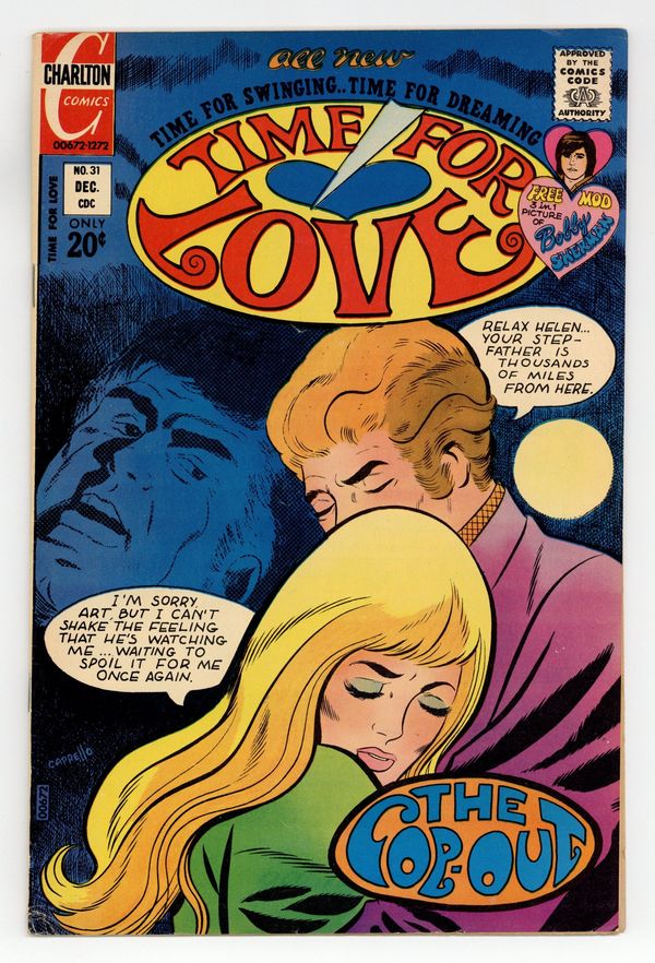 Published Dec 1972 by Charlton Comics Group.$21.00Cover by Art Cappello. Stories and art by Joe Staton, Tony Tallarico, Nicky Zann, Art Cappello, Charles Nicholas and Vince Alascia. Couples navigate the mazelike pathways of relationships and love in the 1960s and '70s. Helen and Art must travel thousands of miles to be together, and even then, they're not sure if they're free from her wealthy, powerful stepfather. When she gets suspicious of all the time fiance Alan is spending in France, a woman decides to make a trip to Paris to see what's up. A redheaded woman learns that handsome cop Pat has been looking out for her when she gets attacked on the street. Plus a pinup of '70s teen heartthrob Bobby Sherman, and a one-pager with art by E-Man co-creator Joe Staton. Pat's Pet; Good-Bye Darling; So Far Away, My Love; Teen-Age Troubles; He Doesn't See Me!; The Cop-Out. 32 pages, Full Color. Cover price $0.20.