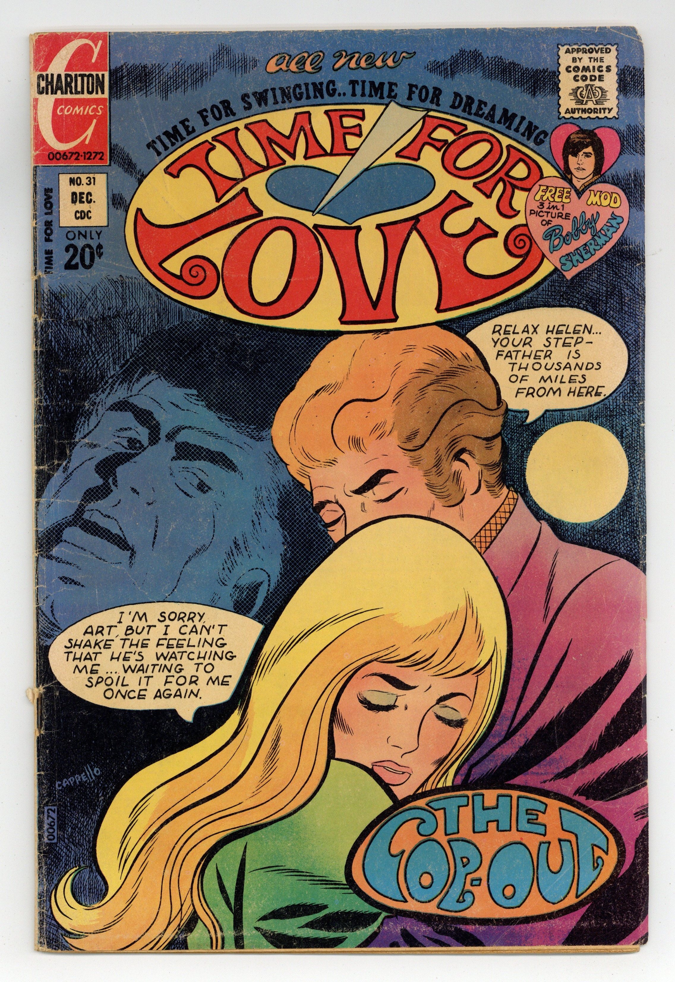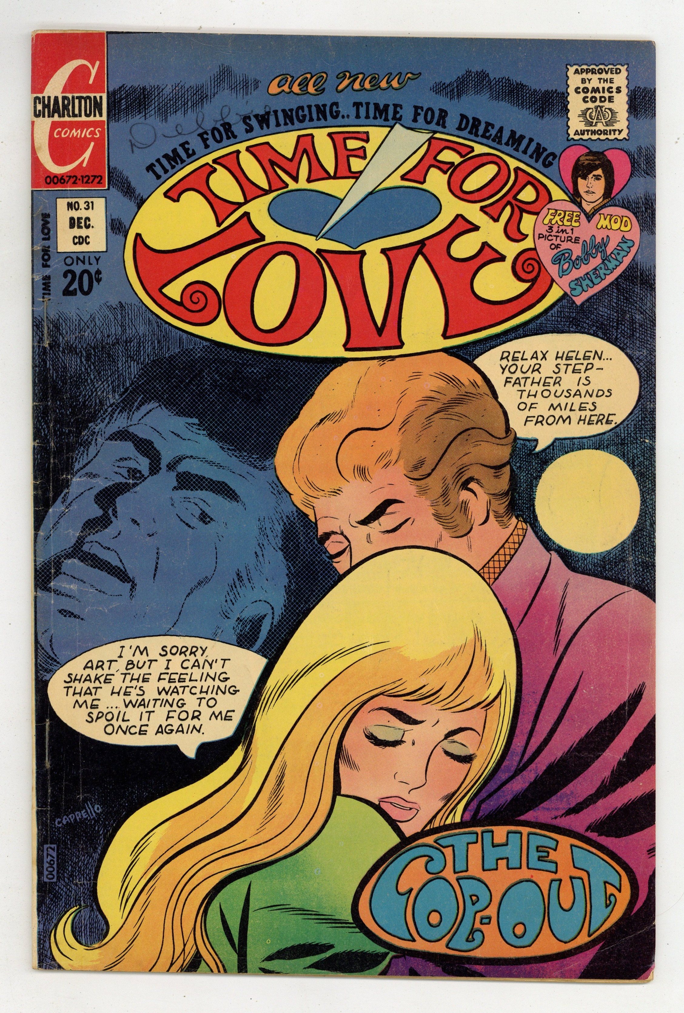 Published Dec 1972 by Charlton Comics Group.$30.00Cover by Art Cappello. Stories and art by Joe Staton, Tony Tallarico, Nicky Zann, Art Cappello, Charles Nicholas and Vince Alascia. Couples navigate the mazelike pathways of relationships and love in the 1960s and '70s. Helen and Art must travel thousands of miles to be together, and even then, they're not sure if they're free from her wealthy, powerful stepfather. When she gets suspicious of all the time fiance Alan is spending in France, a woman decides to make a trip to Paris to see what's up. A redheaded woman learns that handsome cop Pat has been looking out for her when she gets attacked on the street. Plus a pinup of '70s teen heartthrob Bobby Sherman, and a one-pager with art by E-Man co-creator Joe Staton. Pat's Pet; Good-Bye Darling; So Far Away, My Love; Teen-Age Troubles; He Doesn't See Me!; The Cop-Out. 32 pages, Full Color. Cover price $0.20.