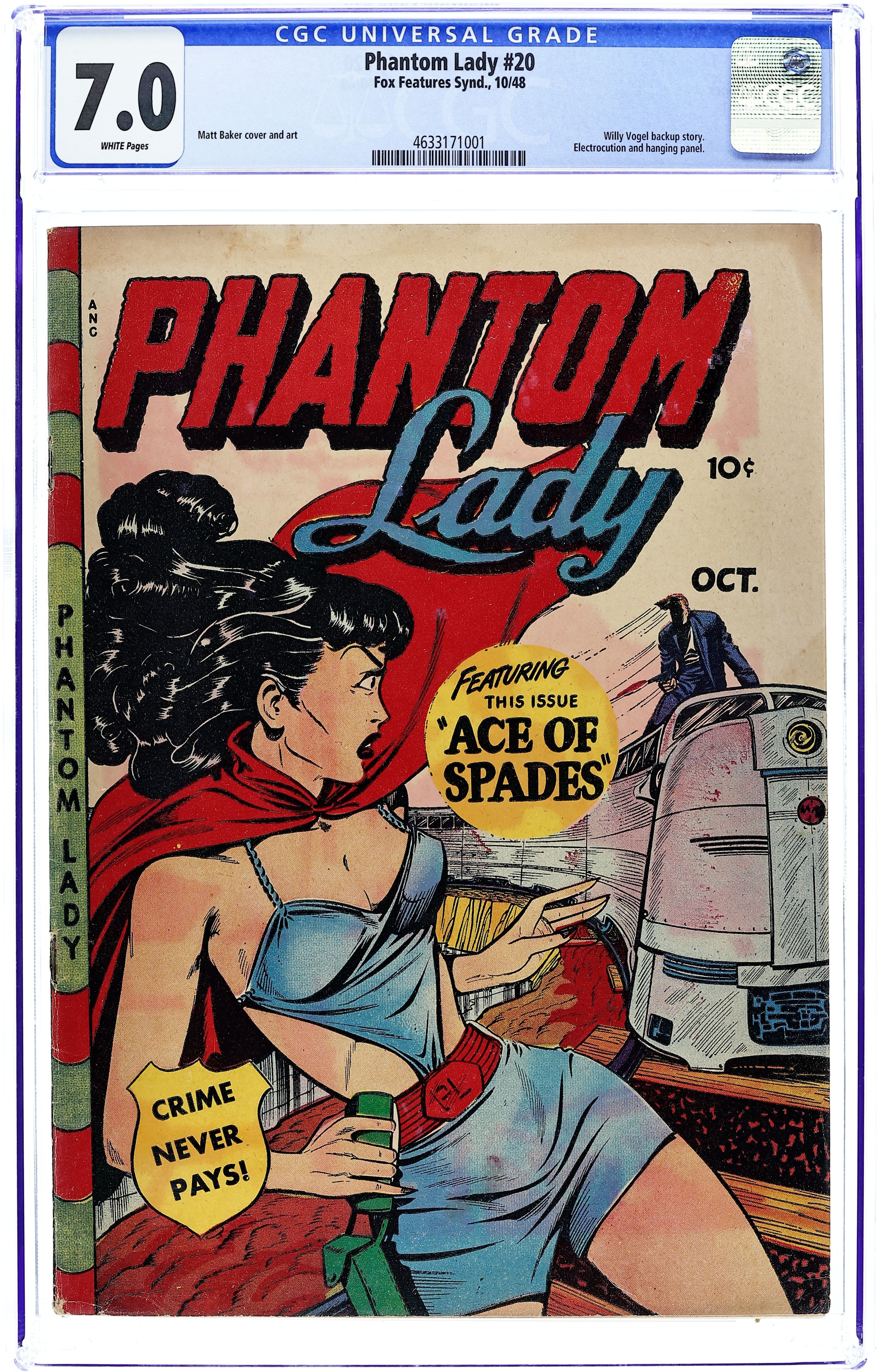 Cover art by Matt Baker. Bullets For Ballots! starring Phantom Lady, art by Matt Baker. Ace of Spades! starring Phantom Lady, art by Matt Baker. Booked for Murder! text story. Willy Vogel, the Gray Phantom—A True Crime Story. 36 pgs. $0.10. Cover price $0.10.