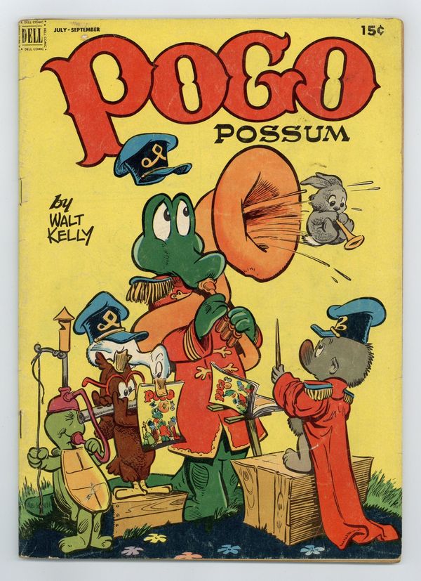 $10.50Cover art by Walt Kelly. Scripts and art by Walt Kelly. Untitled one-page story; Pup Dog ends up catching the big fish, while Beauregard only catches Pup Dog's small bone. "Lulu Red Ridey Hoops"; Pogo and Albert acting out "Little Red Riding Hood" with Pogo playing Riding Hood, Albert playing the wolf, Beauregard posing as a man guiding Riding Hood along, and the ladybug as Riding Hood's mother. "Down With the Sea and Ships"; Churchy, Howland and Bull Weevil go searching for a peaner [peanut] brittle mine, but end up sinking their own swamp barge. "Invisible Pie" text story. "The Epic Cure"; Albert eats a concoction of carrots and cotton, Pogo's soap and water, and the pickings up from Pogo's floor. "Beared Fangs"; Pogo gets caught in a bear trap, and Howland and Churchy assume it to be Barnstable's teeth. "Mother's Gooseberry Rinds"; Albert acts out Lewis Carroll's "Jabberwocky." Untitled one-page story; Churchy tries to catch the cricket, but ends up catching himself. Untitled one-page story; Albert ends up shooting his mirror image. 52 pages, full color. Cover price $0.15.