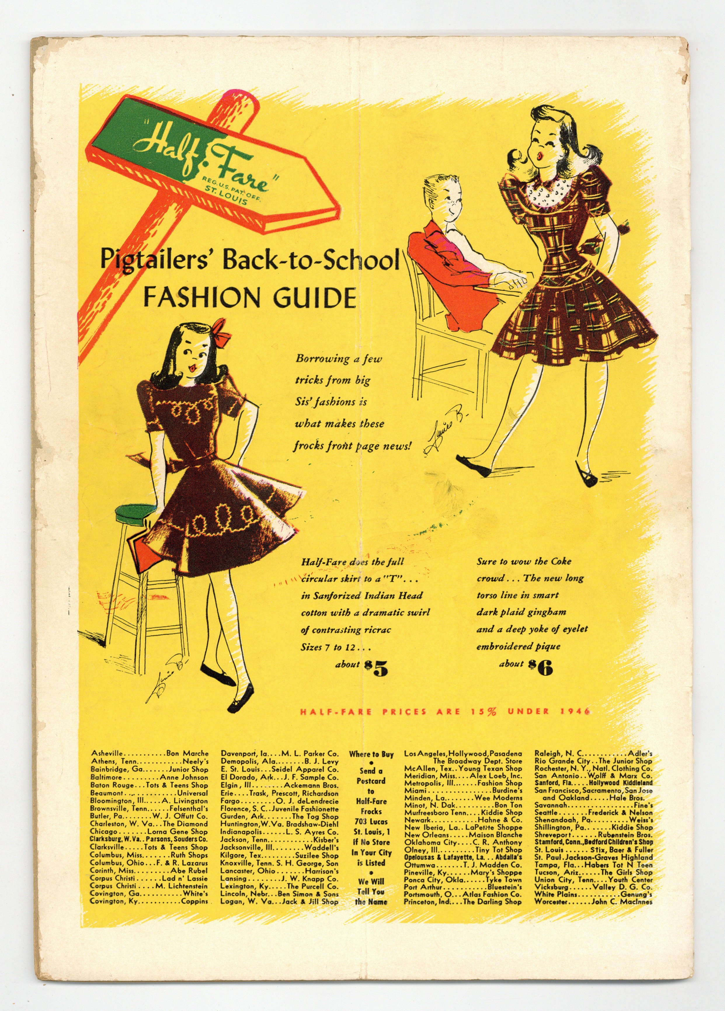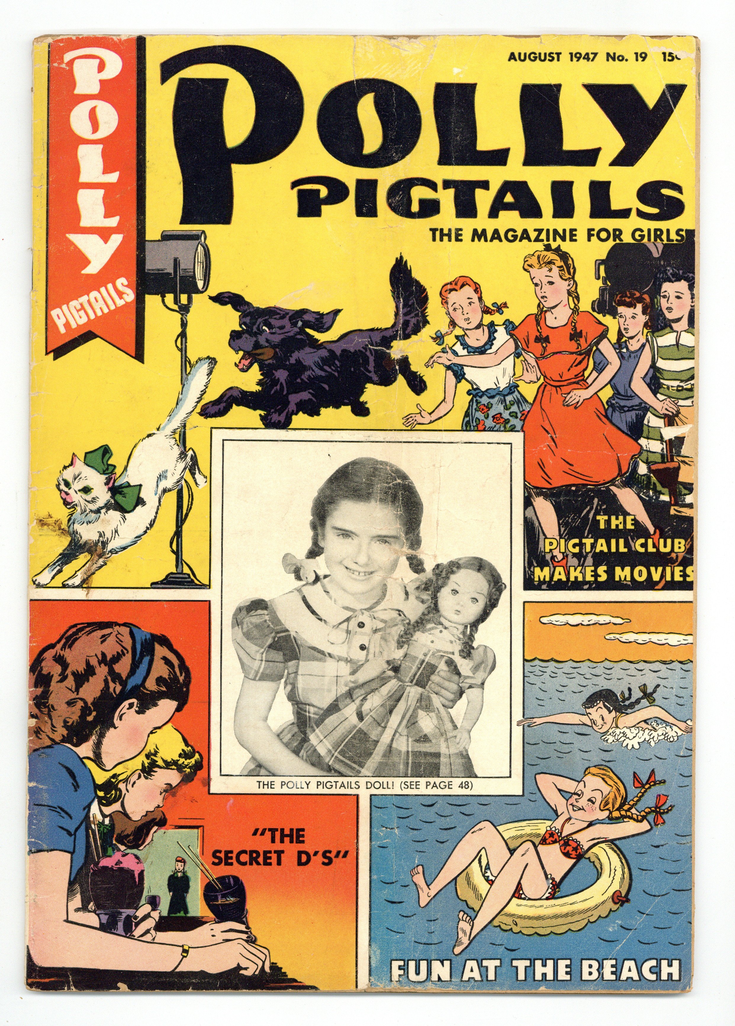 Stories and art by Vic Herman, Dee Bannion, Elizabeth Eicher, Anita Rehbock, Adrien Stoutenburg, Barbara Yager, Lois Withers, Nancy Williams, Laura Leahart, and Marie Cummings. A magazine for girls from the producers of Parents' Magazine, with stories, fashion and advice as well as comics. A profile of the Professional Children's School, where young working actors can catch up on their studies; The Pigtail Club's dog gets loose on a movie set; A comics biography of trailblazing combat nurse Florence Nightingale. The Pigtail Club; My Big Sister; Schoolhouse on Broadway; The Secret D's; Tizzie on Vacation; Lady With a Lamp; Headline Girls; Jingle Shells; Hobbies; Pick Your Portrait; Plaid Mad; The Mystery of the Floating Village; Pigtailers Talk Things Over; Polly Prefers; Fun With Fashion; Needle Play; Club News; Polly in the Kitchen. 52 pages, Full Color. Cover price $0.15.