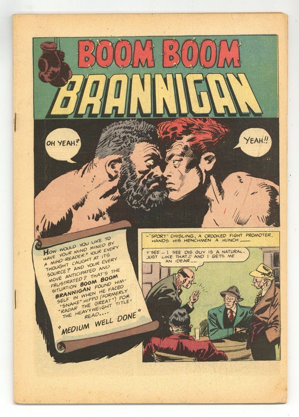 Medium Well Done starring Boom Boom Brannigan, art by Charles Voight. Untitled stories starring Frankenstein (script and art by Dick Briefer) and Jason. Mystery Hill text story by Dorothy Davis. The Spook's Nooks, or, The Ghost's Ghost starring Sir Prize starring Charles Voight. The Bank Robber's Holiday starring Yank & Doodle & Black Owl. $0.10. Cover price $0.10.