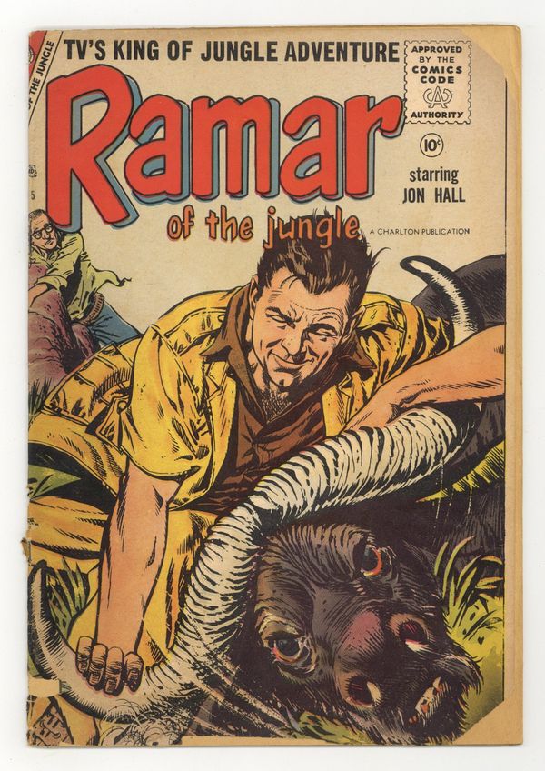 Cover by Maurice Whitman. Stories and art by Charles Nicholas, Jon D'Agostino, Bill Molno, Sal Trapani and Maurice Whitman. Jungle adventure based on a TV series, as white doctor Tom Reynolds sets up shop in Africa and earns the name "Ramar." Ramar seeks the mysterious tribe of Little Dancing People deep in the jungle - or is it just an incredible jungle hoax by the Mau Mau guerrilla army? In a remote, primitive jungle region, Ramar encounters those who live in the shadow of the Temple of Dragons. Mary, a white woman raised in the jungle by a native tribe after her parents' murder, thinks all white men are evil, and that includes Ramar. Plus a note from Alfred Fago, the Executive Editor of Charlton, attesting to the "good taste" and so forth of Code-approved comics. The Jungle People; The Little Dancing People!; Fear of the Flame; Elephant Enemies; Temple of Dragons; It's a Fact That...; Maneater; Booty; The Little Folk of Africa. Final issue of the series. 32 pages, Full Color. Cover price $0.10.