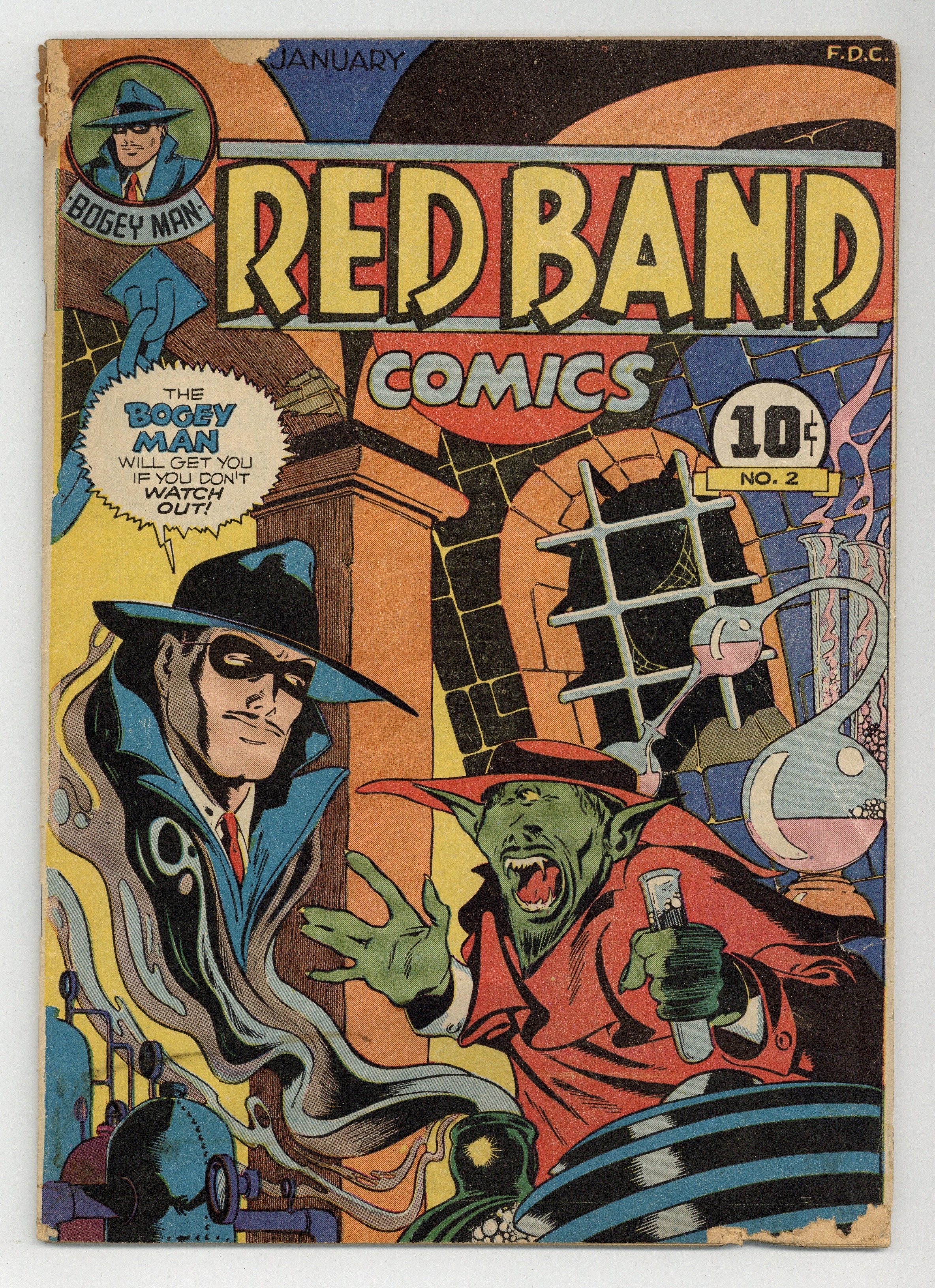 Cover by Bob Fujitani. Stories and art by Gil Kane, Bob Gordon, Sam Cooper, Bruce Elliott, Jerry Schiano, August Froehlich, and Henry Kiefer. Despite the #2 and January 1946 date on the cover, the cover and contents are identical to Red Band Comics (1945) #1. Masked heroes, soldiers, and adventurers in this WWII-era anthology. Strange chance leads young Joe Djerk to become apprentice to the Sorcerer, in a story featuring nice magical art and tongue-in-cheek humor, such as a wizard mentioning Cthulu. Rangers Sarge and Angel face a desperate mission in the South Pacific, in an early story by future Marvel legend Gil Kane. In a story that deliberately breaks the fourth wall, Mortimer X. Mortimer gains the powers of other characters in his comic book (i.e. Bogey Man, The Sorcerer, etc.) to become spoof superhero Captain Milksop. Distinctive-looking Plutonian bad guy Satanas was listed in Jon Morris's 2017 book The League of Regrettable Supervillains. Bogey Man; First Aid; The Sorcerer and His Apprentice; Gag Parade; Sgt. Strong: Devil Dog Mission; Passing the Buck; Comedy Parade; Captain Milksop; Igloo Iggie; Satanas. 48 pages, Full Color. Cover price $0.10.