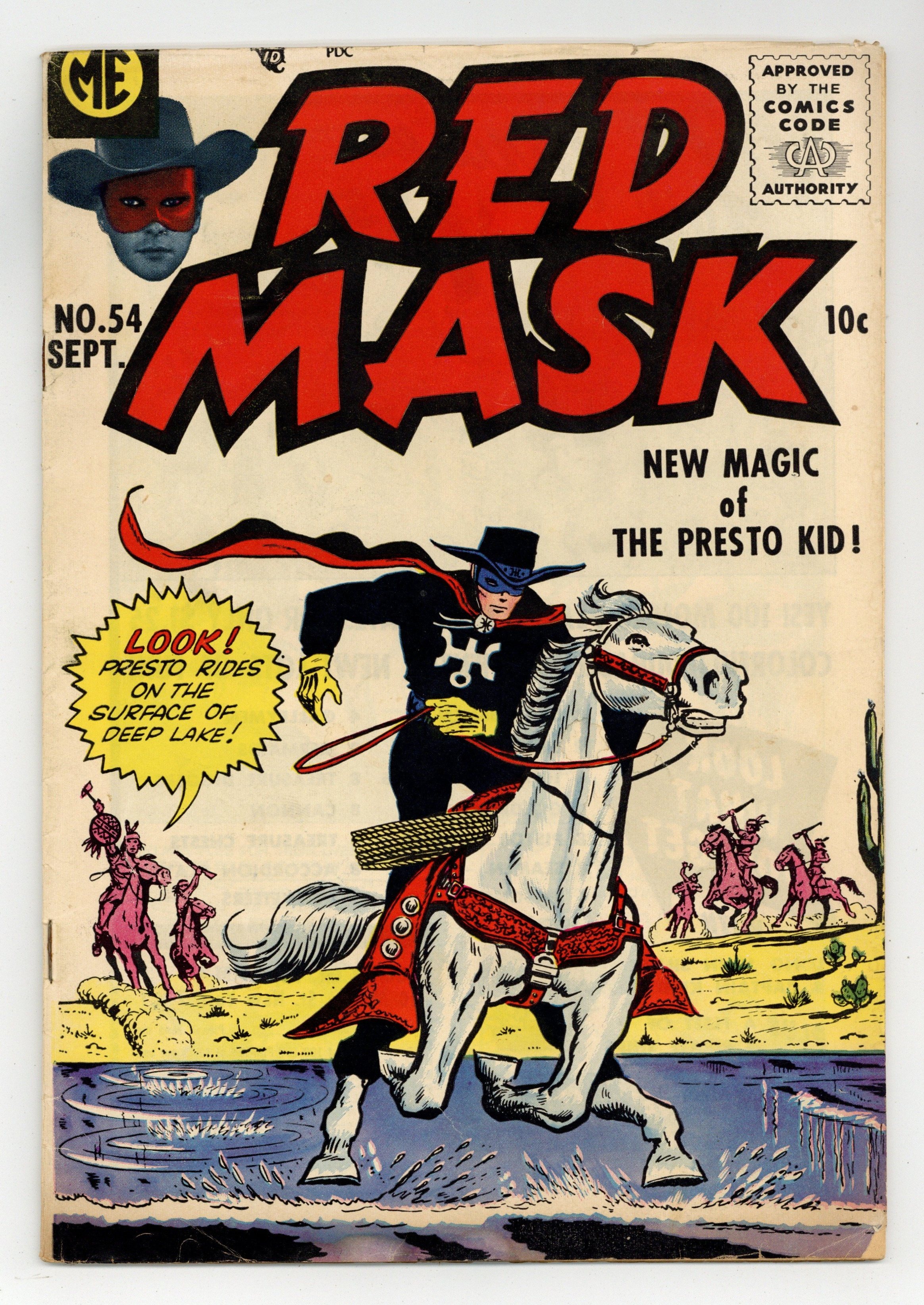 Stories by Carl Memling and others. Art by Frank Bolle, Fred Guardineer and Dick Ayers. Cover by Dick Ayers. Western adventure starring movie cowboy Tim Holt. When the town sheriff takes a vacation, his inept cousin steps in. The Presto Kid uses magic to prevent an outlaw from starting a war with the native tribes. Redmask and Black Phantom try to find out why outlaws are targeting a penniless farmer. The Luck of Major Hanley; The Substitute Sheriff; The Presto Kid: The Floating Renegade!; Western Dictionary; The Unknown Treasure! Final issue of the series. 32 pages, Full Color. Cover price $0.10.