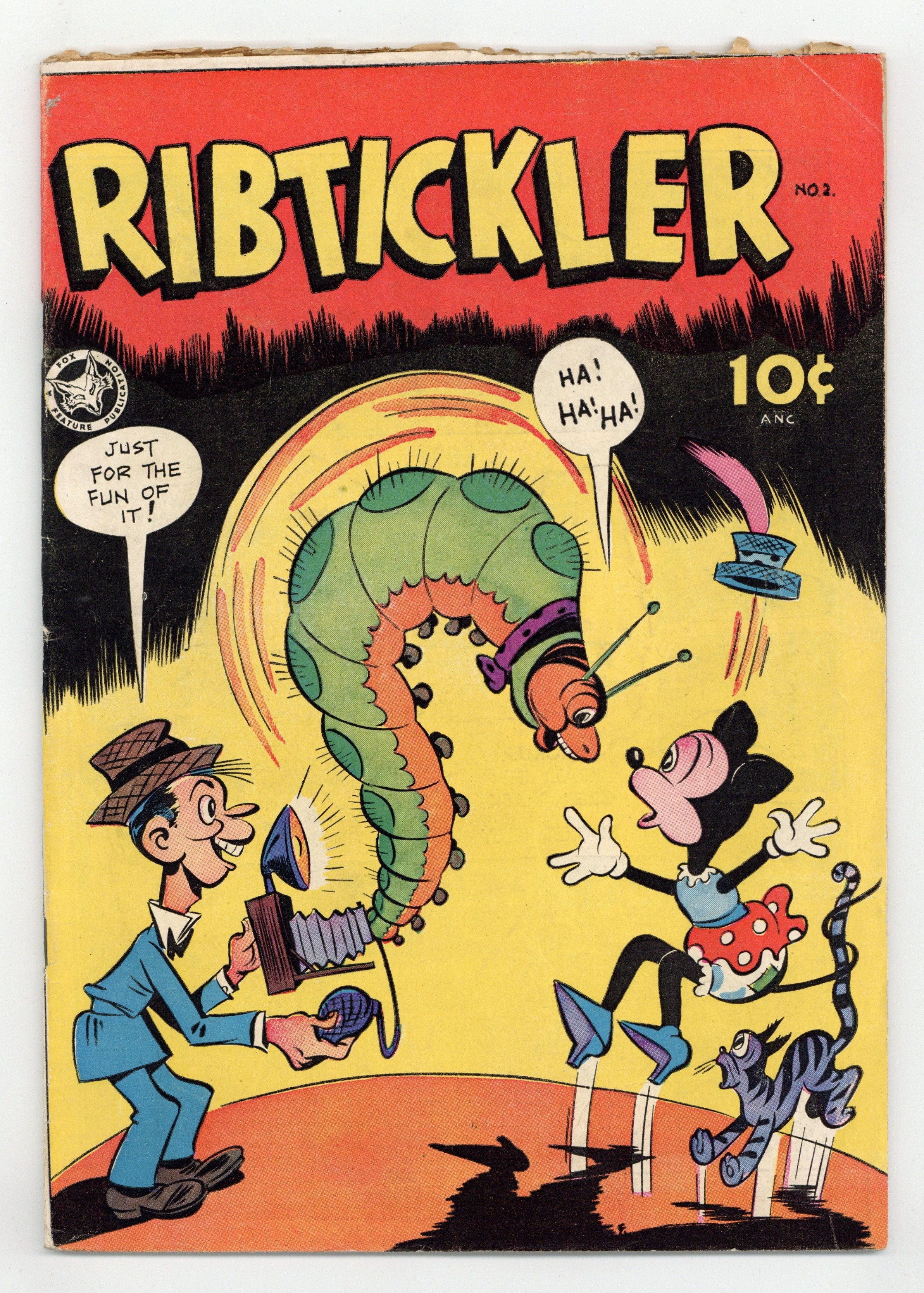 Published 1946 by Fox Feature Syndicate.$18.25Art by Bud Davis, J.L. Keene, Cy King, Les Art, Pat Adams, and Don Drew. Humor comics from Fox Feature, featuring funny animals, teen hijinx and the like. Karrots the rabbit invents a time-syrup that transports him and Goopy into the past, where they immediately find trouble; Cat criminal Snard and his inept gang plot a kidnapping; Slap-Happy the bear goes to ridiculous lengths to avoid bad luck on Friday the 13th. Karrots; Walter the Waiter; Crime at No. 9; Dead Men Tell No Tales; Pop Gun Pete; Red Kamphor; Slap-Happy; Gilbert the Gentle Gorilla. 48 pages, Full Color. Cover price $0.10.