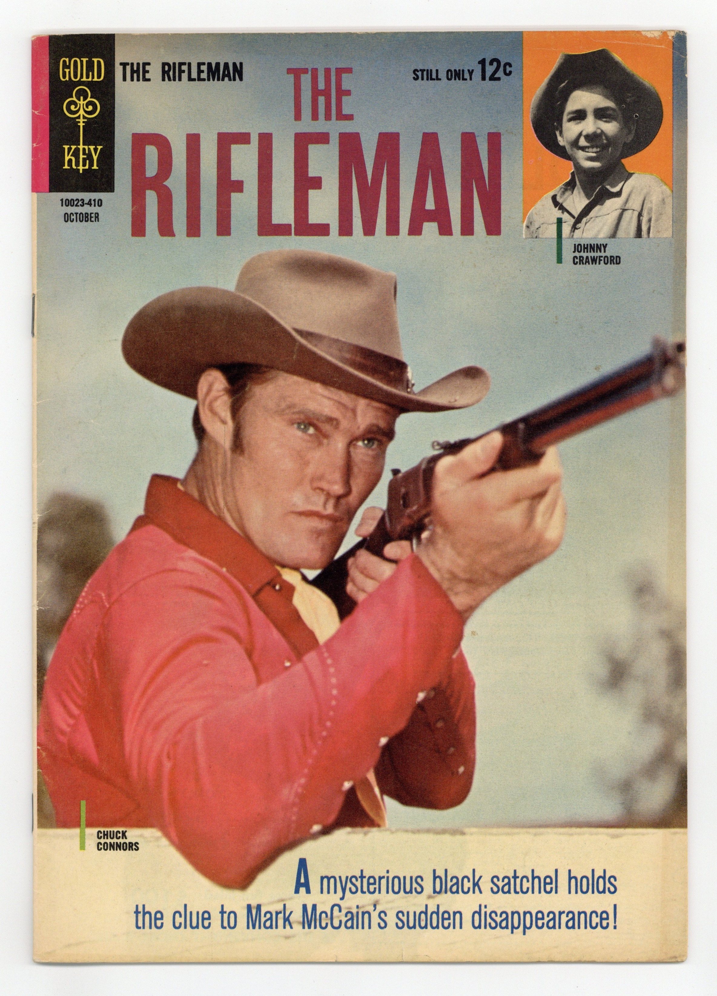 Cover photo of Chuck Connors and Johnny Crawford. Stories and art by Warren Tufts and others. Cover number is #10023-410. Rifle-toting rancher Lucas McCain helps keep order in the Old West, based on the popular TV Western. The homesteading Howard brothers face Pike Webb, who is determined to keep settlers away from the land he claims. After Lucas's son Mark disappears, Lucas finds a clue in a mysterious black satchel. The Challenge; The Half-Way Mark; Change of Mind; The Black Satchel. Final issue of the series. 32 pages, Full Color. Cover price $0.12.