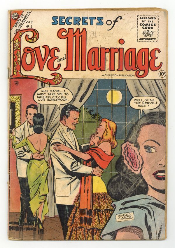 Published 1956 by Charlton Comics Group.$75.00Cover by Dick Giordano and Vince Alascia. Stories and art by Charles Nicholas, Vince Alascia, Bill Molno, Rocco "Rocke" Mastroserio and Jon D'Agostino. Newlyweds find that while love solves some problems, others require negotiation. Anise stumbles on ailing hermit Les, nurses him back to health, and falls in love. Actress Peggy is torn between director Jack and her fiancé back home. Jim and Lily take a six-month break to see if they're really serious about each other. Explanation Not Necessary; Say When!; The Old Love; Trousseau for a Wife; Too Shy; The Sudden Kiss; Trial Ending; Faint Heart; Song of Sorrow. 32 pages, Full Color. Cover price $0.10.