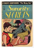 "The Secret!"; Rich and spoiled college girl Marcia Bascomb has been grounded by her young, substitute sorority housemother Scotty until her schoolwork improves; When Marcia discovers Scotty and her fiance petting in the housemother's room, she vengefully threatens to expose Scotty's apparent moral lapse to the college authorities; With Scotty at her mercy, Marcia defiantly breaks curfew and, with a laugh, dares Scotty to report her. "To Win Your Love," pencils by Bob Forgione, inks by Jack Abel; Suzanne and Warren are outstanding Westover College swimmers; Their romance is frustrated by Suzanne's competence, spirit, and pride however, and Warren's notions about traditional gender roles. "The Wrong One," art by David Gantz; Lois Mason attends her mother's alma mater and reluctantly joins her mother's beloved sorority; Much has changed since Mrs. Mason's participation and, unknown to her, the sorority has become a snobbish, controlling clique; When Lois dates Hank (one of the sorority's 'wrong ones'), the housemother threatens to write to Mrs. Mason. "The Faint Heart," pencils by Ben Brown, inks by David Gantz; Bess accepts a bet from Greta to wrangle a kiss from bashful, handsome Paul; To that end, Bess maneuvers her way into his company and the two begin casually seeing one another. "Kid Sister"; Marsha Cooper meets and dates Ralph Munson, a stranger in town looking for a job; Marsha's glamorous sister Eve captures Ralph's interest and the two begin dating. 36 pgs., full color. Cover price $0.10.