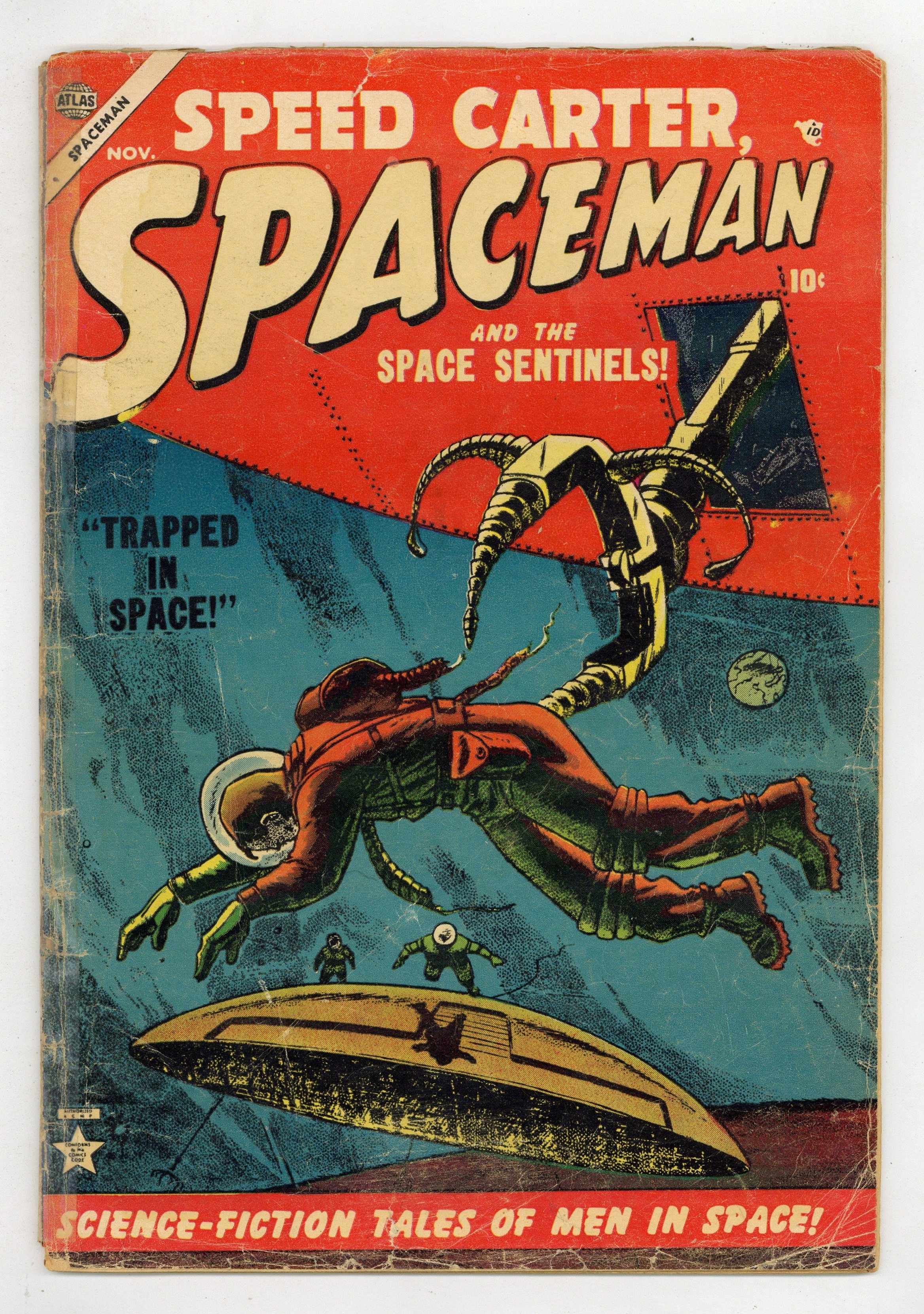"United Planets Peace Organization," "The Half-Horrors of Hyades," "Who Stole the Sun," and "The Space Trap!" (all art by Joe Maneely). Back-up story, "Famous Explorers of Space No. 2: Mercury" (art by Benulis/Abel). Two-page text story, "The Stowaways." 36 pages, full color. Cover price $0.10.