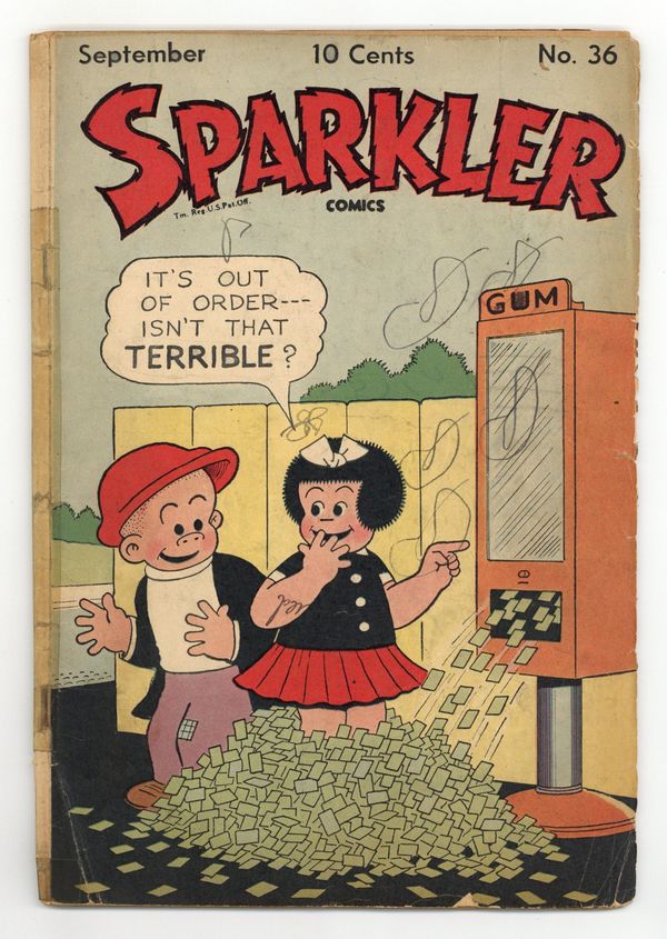 Stories and art by Burne Hogarth, Paul Berdanier, Fred Methot, Bernard Dibble, Ernie Bushmiller, Jack Sparling, Drew Pearson, Bob Allen, Milburn Rosser, Rudolph Dirks, Charlie Plumb, Bill Conselman, Harry O'Neill, and Raeburn Van Buren. United's anthology featured reprints of early comic strips plus an original hero, The Spark Man, who joined the military to fight in WWII. The Spark Man gets a mental communication from a comatose soldier, warning him of an imminent attack. Fritz escapes the lion, and tries to signal the Captain and Mama with the location of the island where the stork brought him. Bombo and Mr. Biltybux set out to find wives, and Biltybux is shocked to see Bombo escorting a beautiful bride mere moments later. Plus a Tarzan adventure by Burne Hogarth. Spark Man; Hap Hopper; Nancy; Captain and the Kids; Ella Cinders; Tarzan; Abbie an Slats; Broncho Bill; Race Riley and the Commandos; Sparkler Salutes; El Bombo. 48 pages, Full Color. Cover price $0.10.