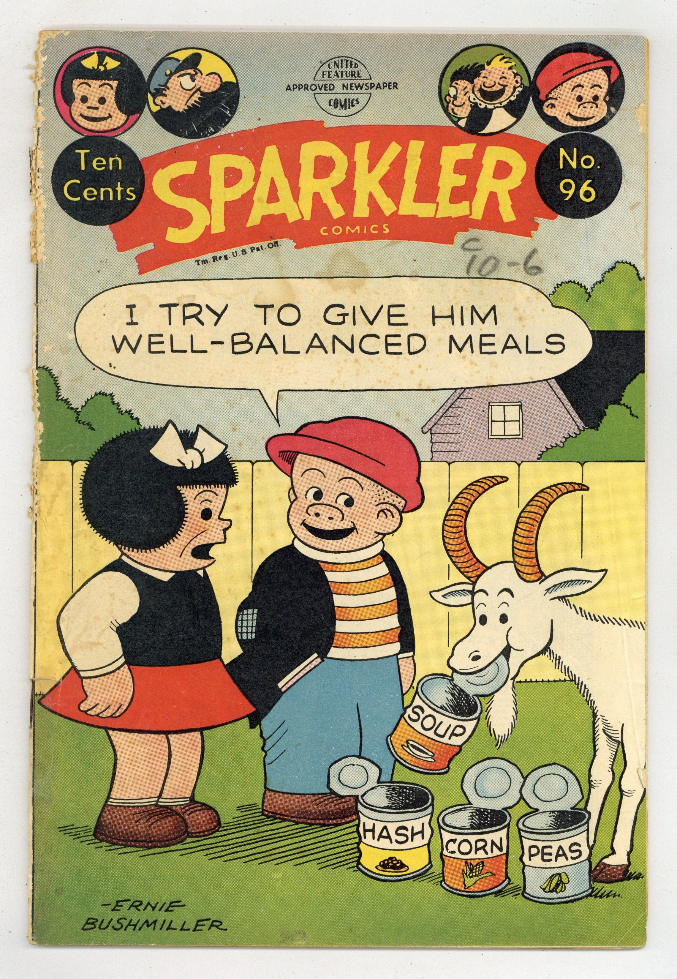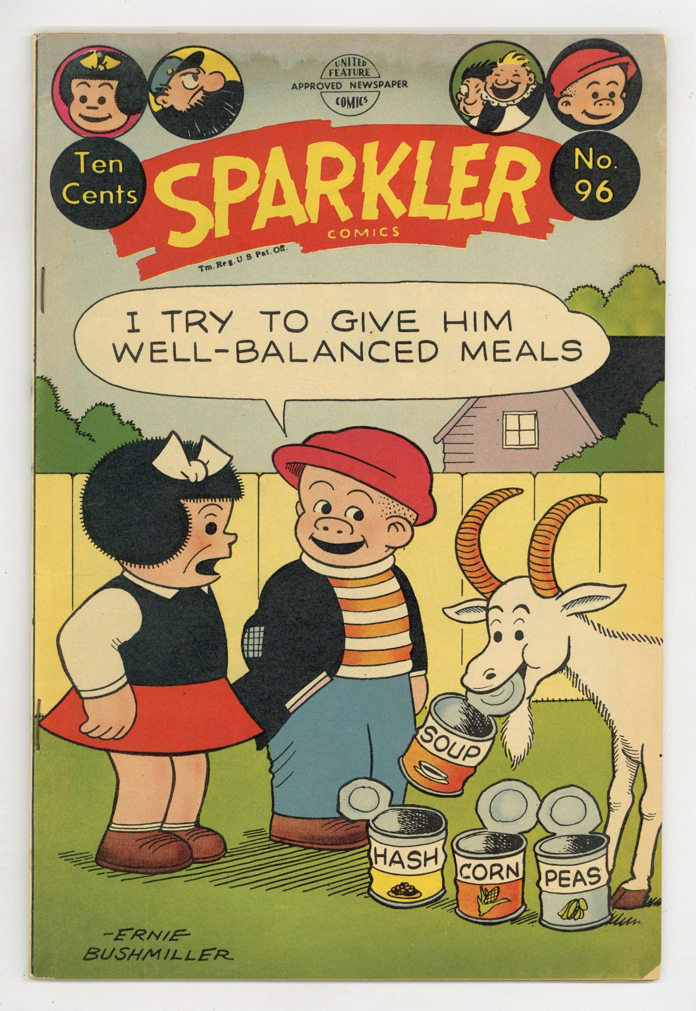 Cover by Ernie Bushmiller. Stories and art by Ernie Bushmiller, Rudolph Dirks, Charlie Plumb, Fred Fox and Ernest G. Osborne. United's anthology featured reprints of early comic strips, including Ella Cinders, Captain and the Kids and Nancy. Ella and Patches learn that Chiffon Velvette is covering up the murder of her fiance. But all is not as it seems on the dude ranch. When the Captain tries to slide down a drainpipe to go play cards, the Kids have him right where they want him. The Family Workshop; Nancy; Ferd'nand; Captain and the Kids; Ella Cinders. 32 pages, Full Color. Cover price $0.10.
