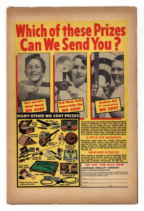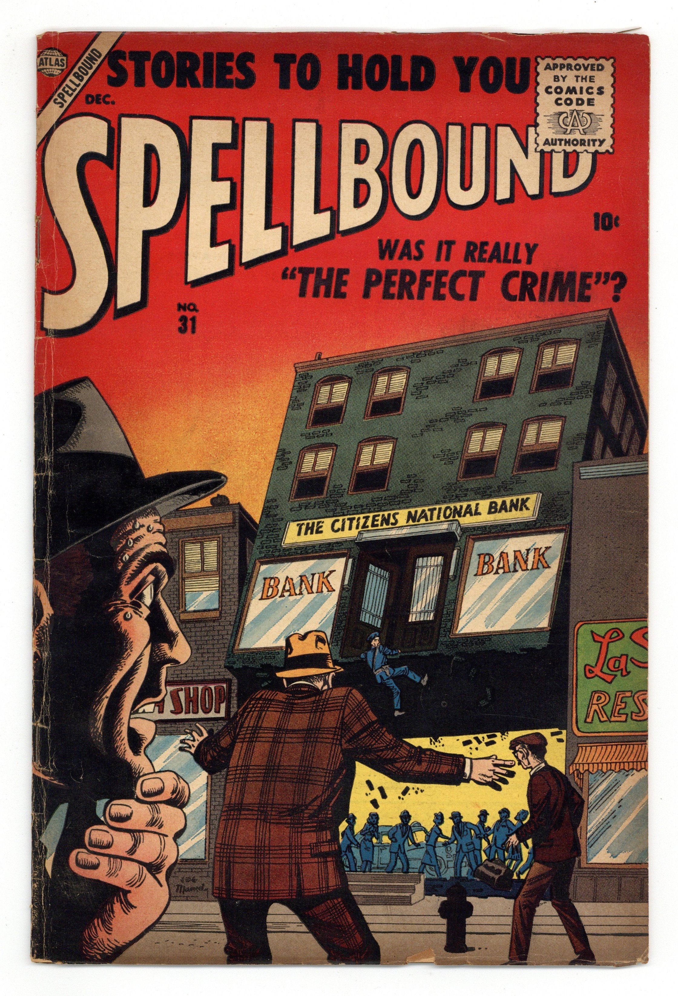 Cover art by Joe Maneely. The Betrayer, art by George Roussos. Space Tune text story. Oh, Perfect Crime, art by Howard O'Donnell. He Won't Open the Door, inks by Jack Abel. The Man Who Didn't Belong, art by Robert Q. Sale. They Dare Not Come, art by Bill Everett. Man in a Trance, art by John Forte. 36 pgs. $0.10. Cover price $0.10.