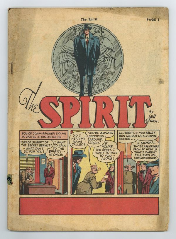 No number (issue 1), "Wanted Dead or Alive" on cover - Cover art by Lou Fine. Wanted for Murder, pencils by Lou Fine (as Will Eisner), inks by Quality staff; The murder of a Secret Service Operative leads the Spirit into the den of a gang counterfeiting 1804 silver dollars. Tony Zacco, Public Enemy #1, pencils by Lou Fine (as Will Eisner), inks by Alex Kotzky; Commissioner Dolan sends the Spirit to Europe to track down a wanted felon, Tony Zacco, whom he finds serving honorably in the U.S. military. Dressed to Kill, script by Bill Woolfolk, art by Lou Fine (as Will Eisner); Dolan informs the Spirit that he is creating a new force of policewomen, over whom Ellen has been appointed as the Sergeant in Charge! A Clock Stops, pencils by Lou Fine (as Will Eisner); Dolan, the Spirit and Ebony look into the murder of a watch keeper, who had a grandfather clock that is involved in a mysterious legend, and nearly results in more deaths. The Eyes Have It, pencils by Lou Fine (as Will Eisner); The Spirit investigates not only the fight game, but the machinations of Evil-Eye Manders, whose stare causes strange things to happen to people. Yellow Eyes Janus, script by Will Eisner, pencils by Will Eisner and Lou Fine; Jason Broadway and soldier Joe Dulan, two people so well liked and popular that no one would ever think of killing them, end up dead, and Dolan & the Spirit investigate a lead. 52 pgs., full color. Cover price $0.10.