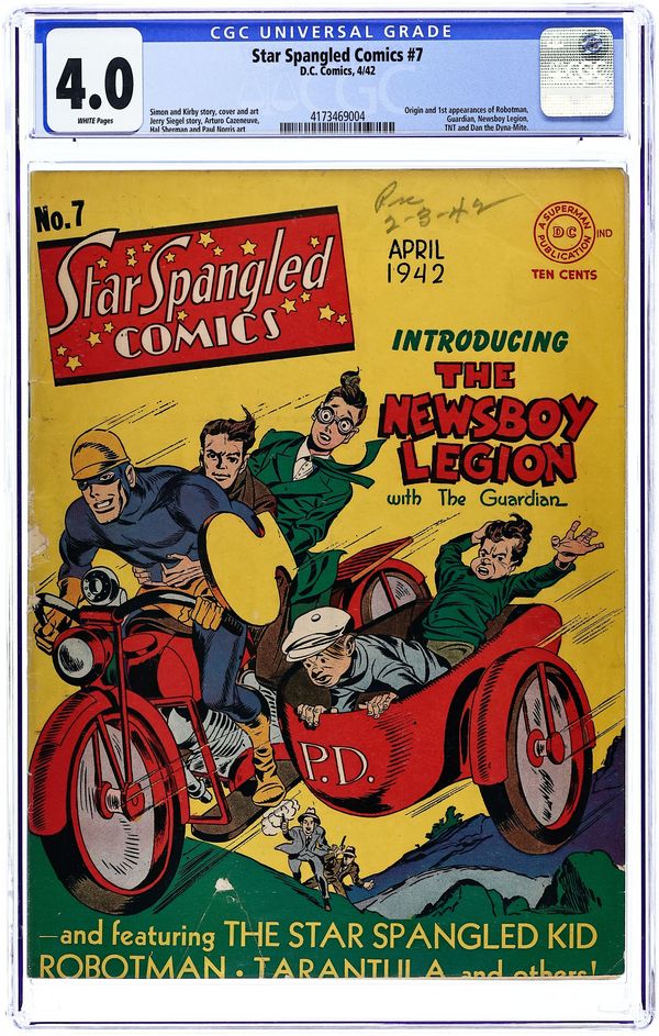 Cover pencils by Jack Kirby, inks by Joe Simon. The Story Of The Newsboy Legion, script by Joe Simon and Jack Kirby, pencils by Jack Kirby, inks by Joe Simon; Jim Harper becomes the Guardian for the first time, and also stops a local gang of kids from being sent to jail, hoping he can help them turn their lives around. The Crime Escradille starring The Tarantula, art by Harold Sharp. Captain X story, art by Arturo Cazeneuve. Robotman story, script by Jerry Siegel, pencils by Leo Nowak and Paul Cassidy, inks by Paul Cassidy; the intro of Robotman. TNT and Dan the Dyna-Mite story, art by Paul Norris. The Picture That Killed starring The Star-Spangled Kid, script by Jerry Siegel, art by Hal Sherman. 68 pgs. $0.10. Cover price $0.10.