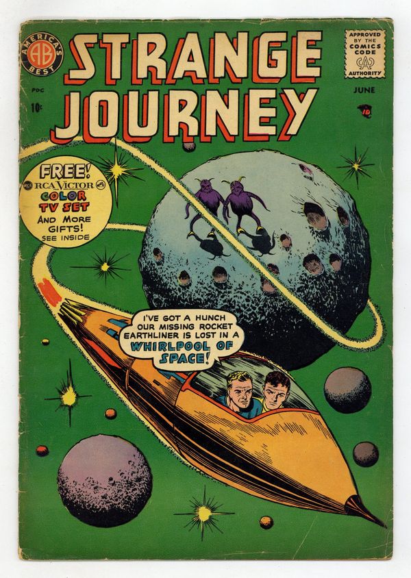 Stories and art by H. C. Kiefer and others. Horror comics from Ajax-Farrell, featuring kid-friendly material as required by the new Comics Code. One of the few comics under Ajax-Farrell's "America's Best Comics" imprint, later borrowed for Alan Moore's unrelated publishing imprint. Al and Tom of the Galactic Guardians investigate after a spaceliner vanishes into a space whirlpool, as the comic completes its transformation from horror to science fiction. The story of Orville and Wilbur Wright and the first successful motorized flight. A wacky story about the life of a TV weatherman that previously appeared in MAD clone Madhouse. Twelve Seconds That Changed History!; Whirlpool of Space; Operation Satellite; Uncle Featherby Weather--Or Not?; Valor Unlimited. Final issue of the series. 32 pages, Full Color. Cover price $0.10.