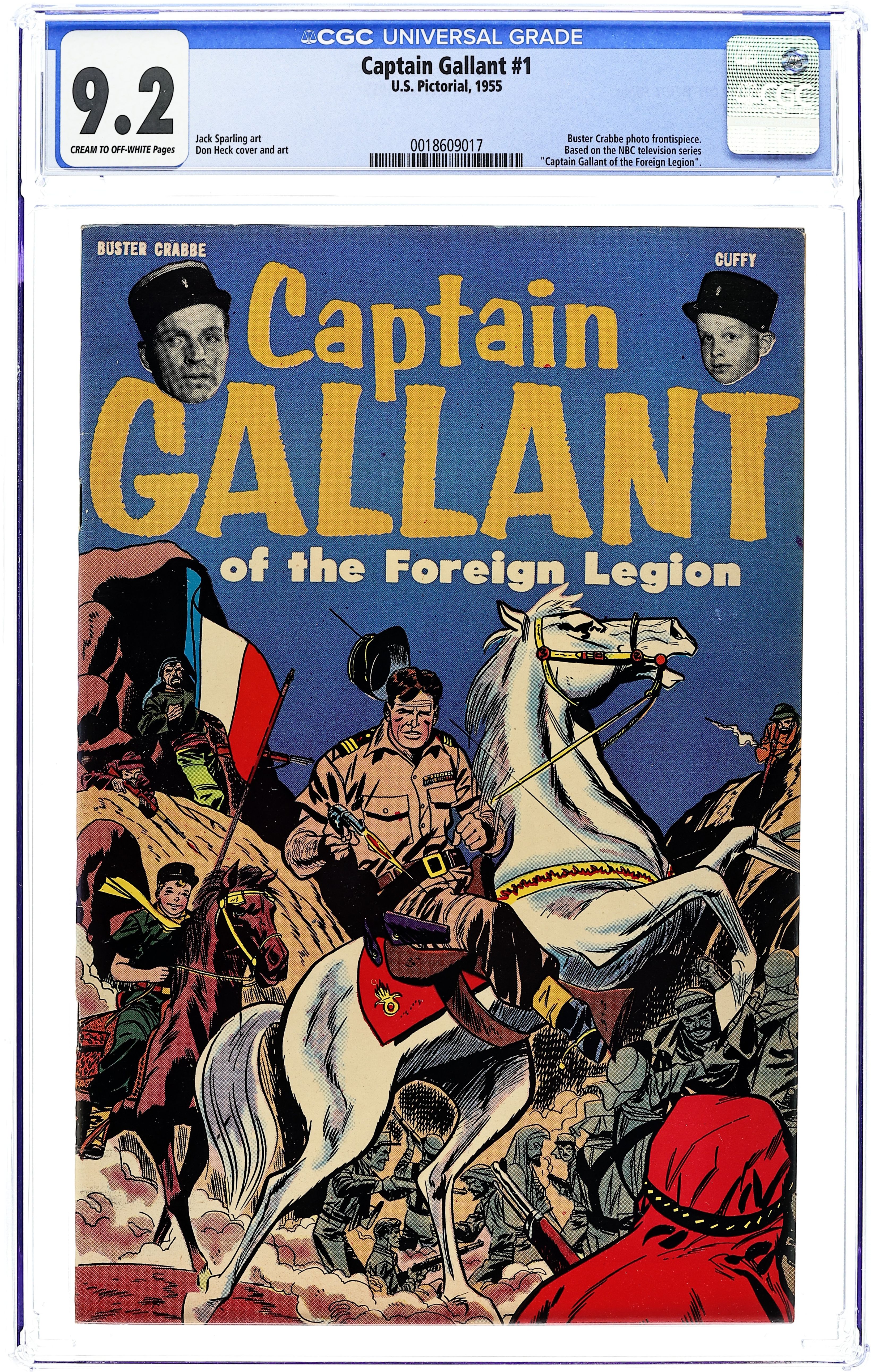 Heinz 57 Varieties ad variant. Cover by Don Heck. Stories and art by Don Heck and Jack Sparling. The comic-book version of the 1955 TV series featuring legendary serial actor Buster Crabbe and his son, Cullen. Young Cuffy and Captain Gallant have adventures in the desert with the French Foreign Legion. This variant issue, sponsored by the Heinz food company, features a Heinz "57 Varieties" ad on the inside back cover, and a Junior Legionnaires Membership Certificate bearing the Heinz logo on the back cover. Fuzzy enters his beloved camel Josephine in a camel race, but his competitors want to sabotage her chances. Gallant and company set out to rescue a kidnapped American woman. Bandits target the supply caravan for the fortress. Cover and some art by future Marvel legend Don Heck. Captain Gallant of the Foreign Legion; Josie Gets Goin; Marcher on Crever, March on or Die; Desert Dee-light; Last Will and Testament of Georges Bohnert; A Saddle for Baba. 32 pages, Full Color.