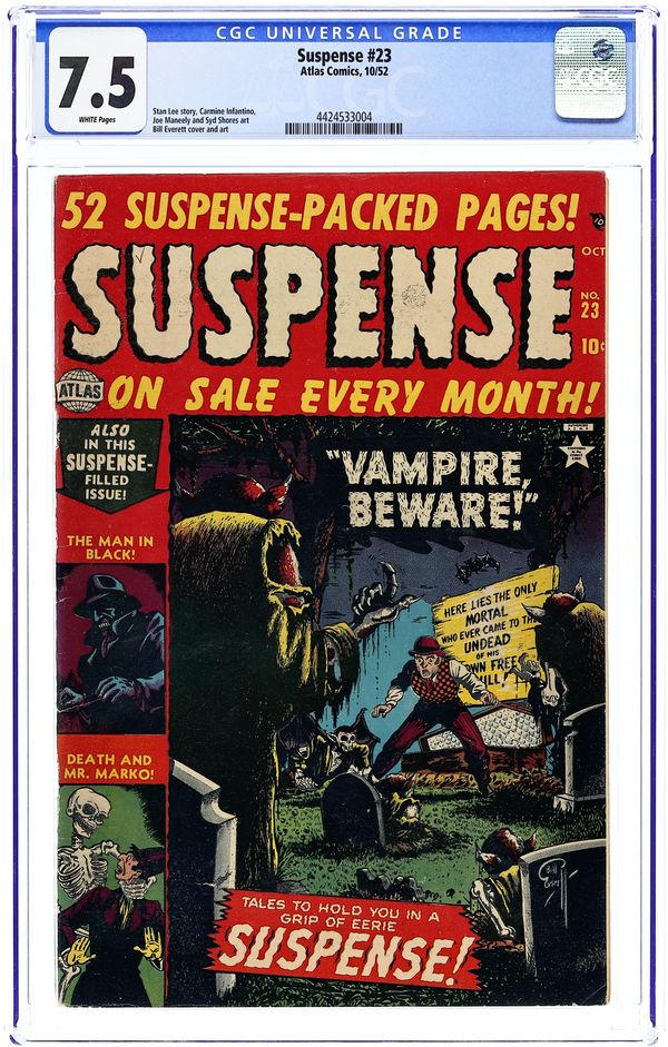 Cover art by Bill Everett. Molu's Secret!, script by Stan Lee, art by Carmine Infantino. Death and Mr. Marko, art by Joe Sinnott. Vampire, Beware!, script by Stan Lee, art by Bill Everett. The Return Trip, art by Cal Massey. The Man in Black, art by Sy Grudko. The Ugly Man, script by Stan Lee, art by Joe Maneely. Skin-Deep, art by Syd Shores. 52 pgs. $0.10. Cover price $0.10.