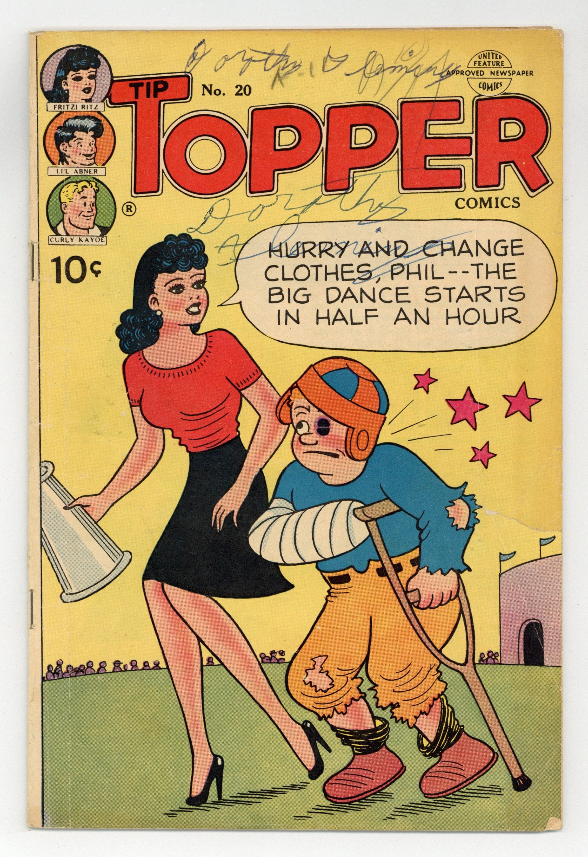 Cover by Ernie Bushmiller. Stories and art by Ernie Bushmiller, Charles Schulz, Al Capp, Sam Leff, and Henning Mikkelsen. Tip-Topper Comics collected some of United Features Syndicates most popular comic strips of the 1940s in full color, including Lil Abner and Fritzi Ritz. Fritzi was later known as "Aunt Fritzi" in the Nancy comic strip. Fritzi figures out how to make popcorn in the toaster. One of the backup strips in the comic is Charles Schulz's Peanuts, then only in its third year; several daily strips are presented in full color. Curly Kayoe lets wrestler Beautiful Benny practice in his gym, but the hulking brute is a germophobe. Strangers arrive in Dogpatch, in a Li'l Abner storyline by Al Capp. Fritzi Ritz; Peanuts; Li'l Abner; Curly Kayoe; Ferd'nand; Willie; Stamp Tips. 32 pages, Full Color. Cover price $0.10.
