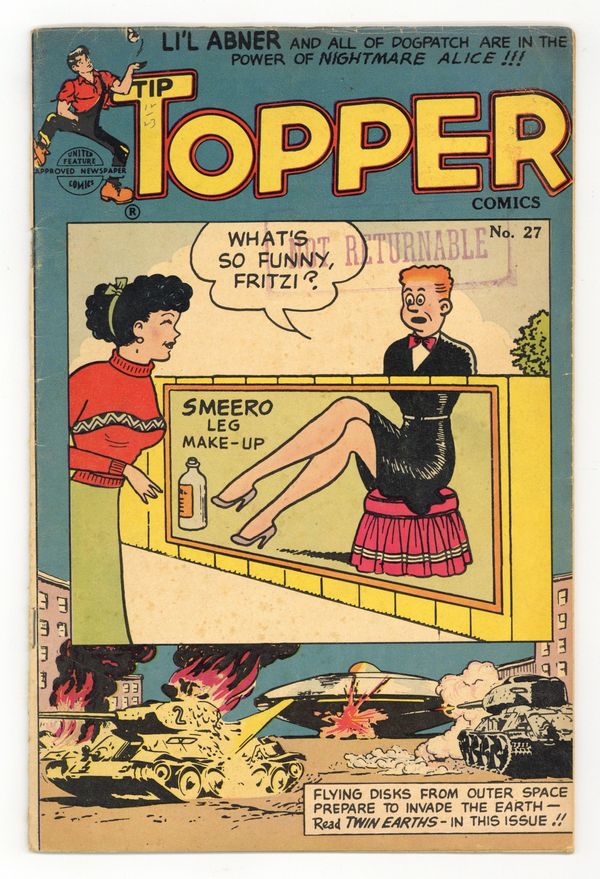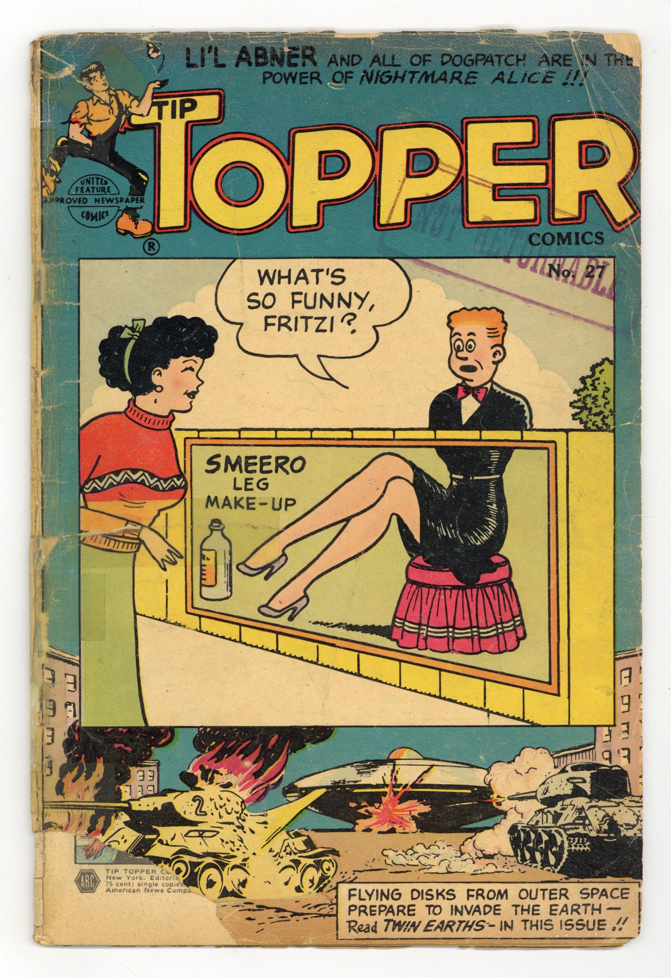 Cover by Al McWilliams. Stories and art by Ernie Bushmiller, Charles Schulz, Al Capp, Oskar Lebeck, Al McWilliams, George Jahns and Elsie Hix. Tip-Topper Comics collected some of United Features Syndicates most popular comic strips of the 1940s in full color, including Lil Abner and Fritzi Ritz. In the sci-fi strip Twin Earths, flying disks from outer space prepare to invade the Earth. One of the backup strips in the comic is Charles Schulz's Peanuts, then only in its fifth year, presented in full color. Li'l Abner and all of Dogpatch are in the power of Nightmare Alice. Plus the Ripley-like Strange as It Seems. Fritzi Ritz; Strange as It Seems; Twin Earths; Li'l Abner; Peanuts; Stamp Tips. 32 pages, Full Color. Cover price $0.10.