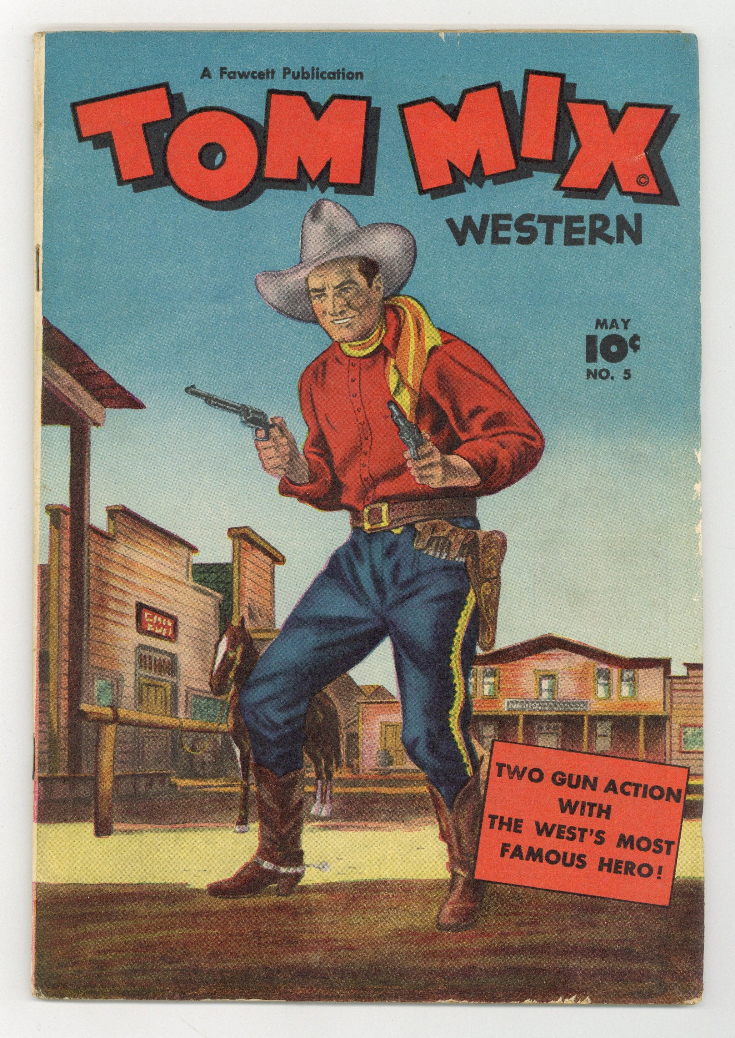 Stories and art by Al Liederman and Bill Brady. Silent-movie cowboy Tom Mix became a pop-culture icon with his 1940s radio show and this tie-in comic. Tom's friends Dick and Moonbeam Runningeagle are threatened by the return of Skunkheart, who wants a human sacrifice. Tom's old foe The Whip (from issue #3) returns with vengeance on his mind. Jed inherits a huge diamond from his uncle, but his two no-good cousins Ned and Red are keen to have it for themselves. The God of Evil!; Billy the Kid and Oscar; The Whip Stings Again!; Bedside Battle; Death Prances in the Arena!; Cowboy Cal; Tumbleweed Jr. Paddles Away; Round Up Time with Tom Mix; Saddlehead; The Death Diamond! 48 pages, Full Color. Cover price $0.10.