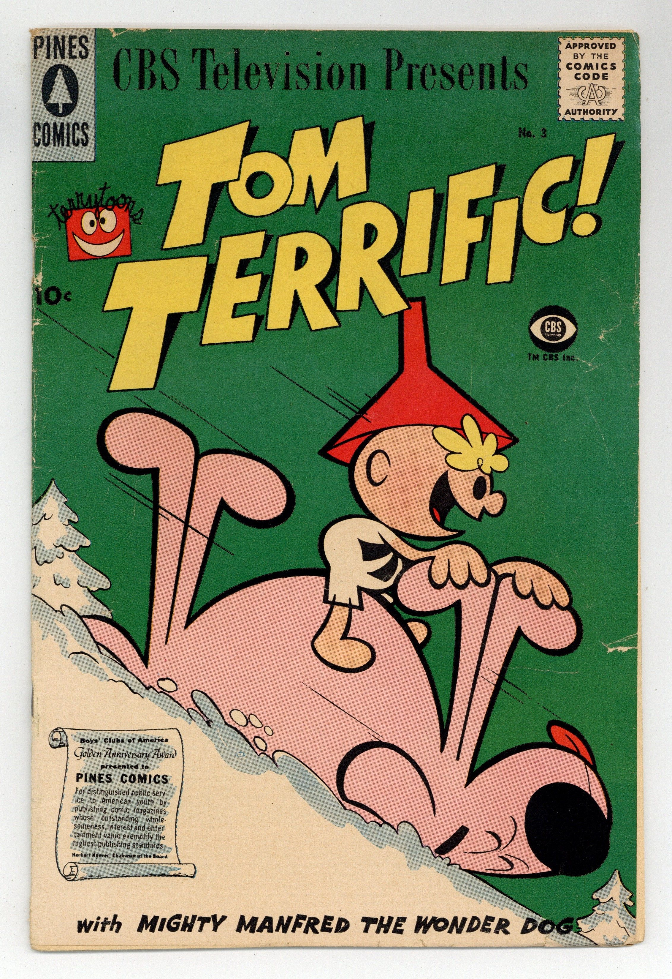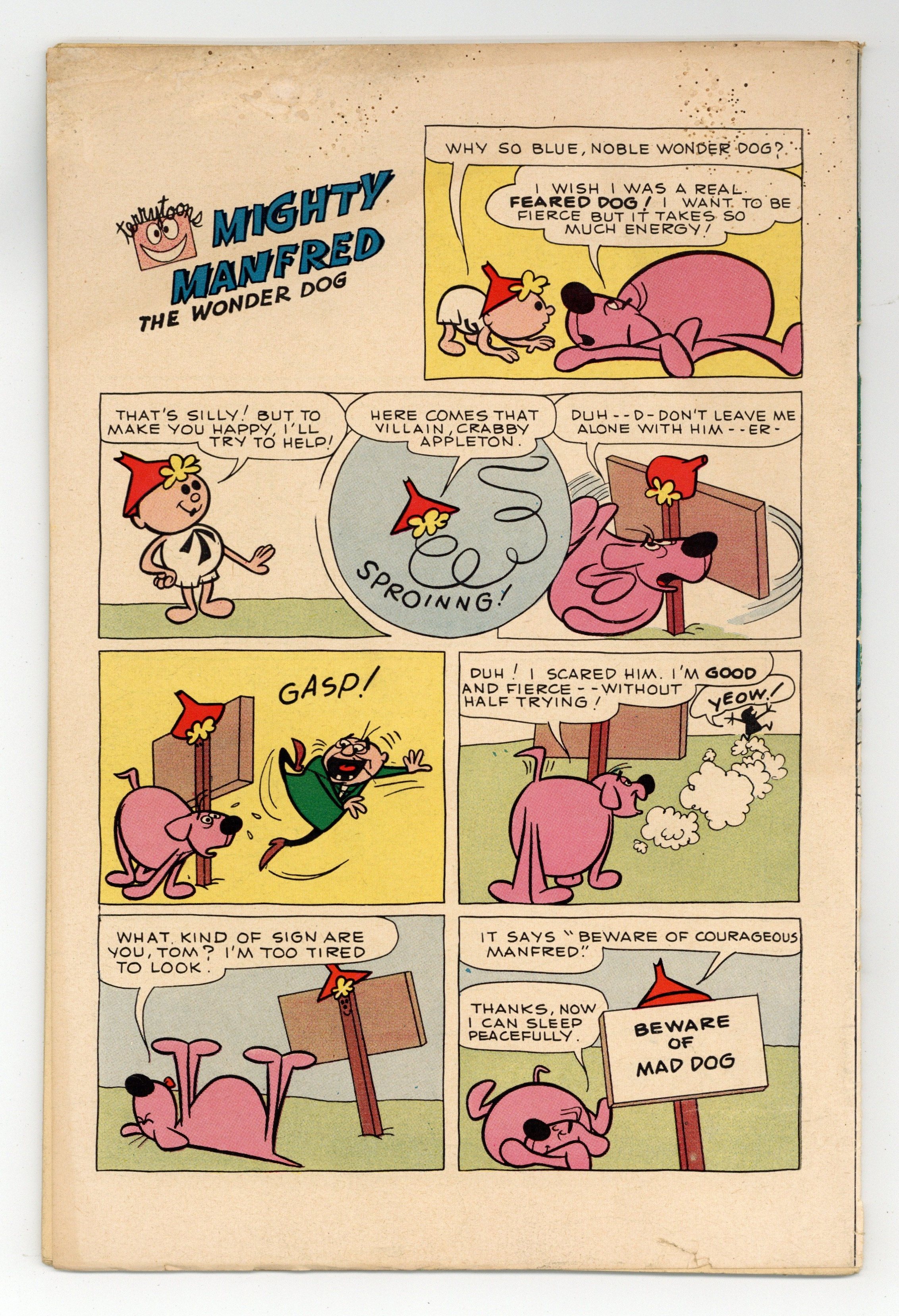 "Pent Up Pals"; Tom is not getting mail from his pen pals, so he transforms into a stamp to trace a letter sent to him. "A Kingly Problem"; Sidney the elephant is afraid of mice so he asks the king of beasts for advice. "Foolish Fog" text story starring Tom Terrific, Manfred the Wonder Dog, and Isotope Feeney. "Boodleberry Pie"; Manfred needs some of his favorite pie to get some energy, but farmer Boodle is out of berries. "First Class Villain"; Crabby just finished a correspondence course on how to be a master of disguise; First he's disguised as a bush, but then he has a more sinister plan. 36 pgs., full color. Cover price $0.10.