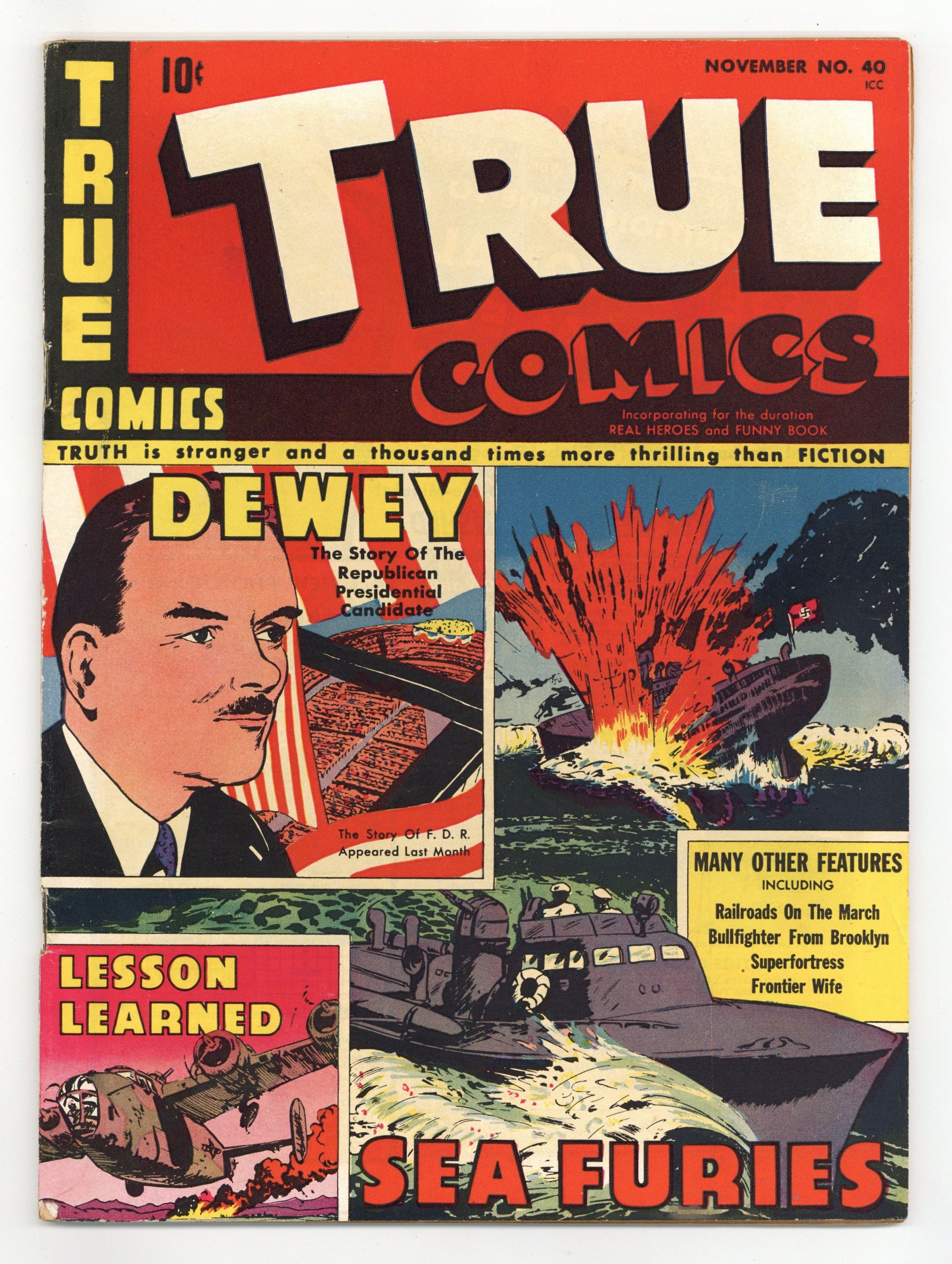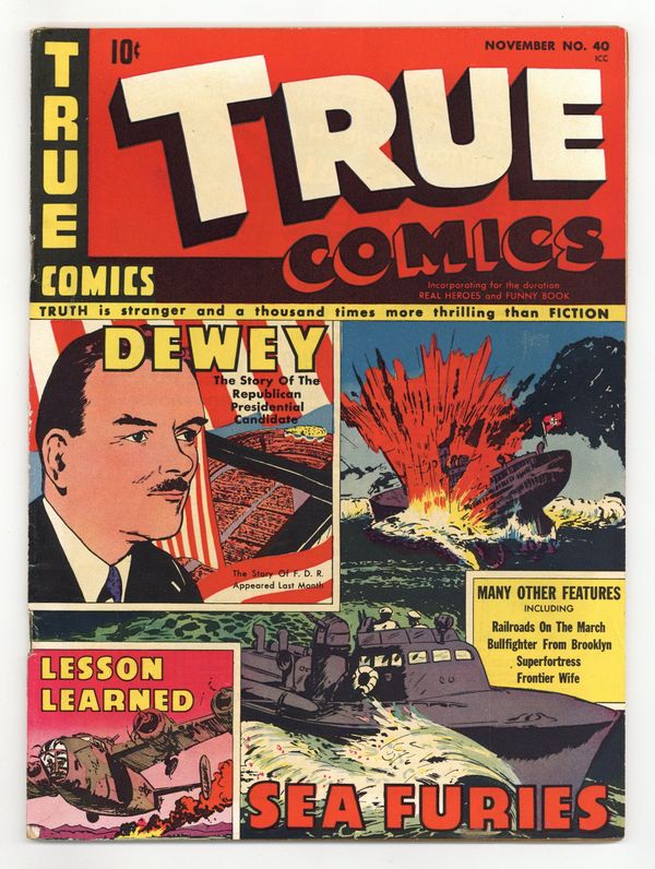 Published Nov 1944 by True Comics Press.$30.00Stories based on actual people and events: Thomas E. Dewey: Dewey; campaign bio. Sidney Franklin: Bullfighter from Brooklyn. Shark Bait; Survivors in a lifeboat catch a shark. Railroads on the March. Superfortress; B-29 bomber. Special Agent of the Federal Bureau of Investigation. Marie Anne Lagimoniere: Frontier Wife; Red River Settlement. Back-Yard Lifesaver; Milkweed division of War Hemp Industries, Inc. Paul Johnson: Lesson Learned; Pilot Paul Johnson habitually buzzes airfields, main streets, etc. Sea Furies; British Torpedo Boats off North Africa in WWII. 52 pgs. $0.10. Cover price $0.10.