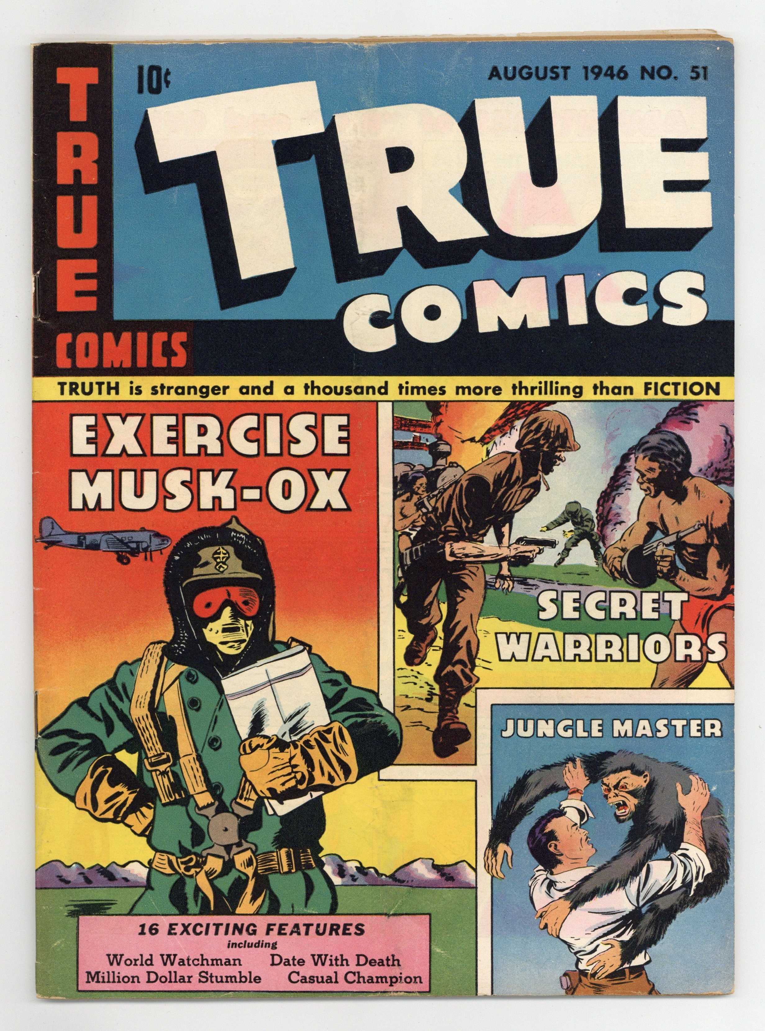 Published Aug 1946 by True Comics Press.$15.50Stories based on actual people and events: Trygve Lie: World Watchman; United Nations. Gift to Big Chief; Eskimos make moccasins for Uncle Sam. Pennsylvania--How It Got Its Name. Dorothy Germain: Casual Champion bio on golfer. Aurelio Tassone: Seabee's Weapon. The Secret Warriors--Office of Strategic Services. Dr. William Morton: Miracle Against Pain. Capain Christopher Mings: $1,000,000 Stumble; finding Spanish treasure in Venezuela, 1658 AD. Frank Buck: Jungle Master. Date with Death; death of Japanese Admiral Yamamoto, WWII. 52 pgs. $0.10. Cover price $0.10.