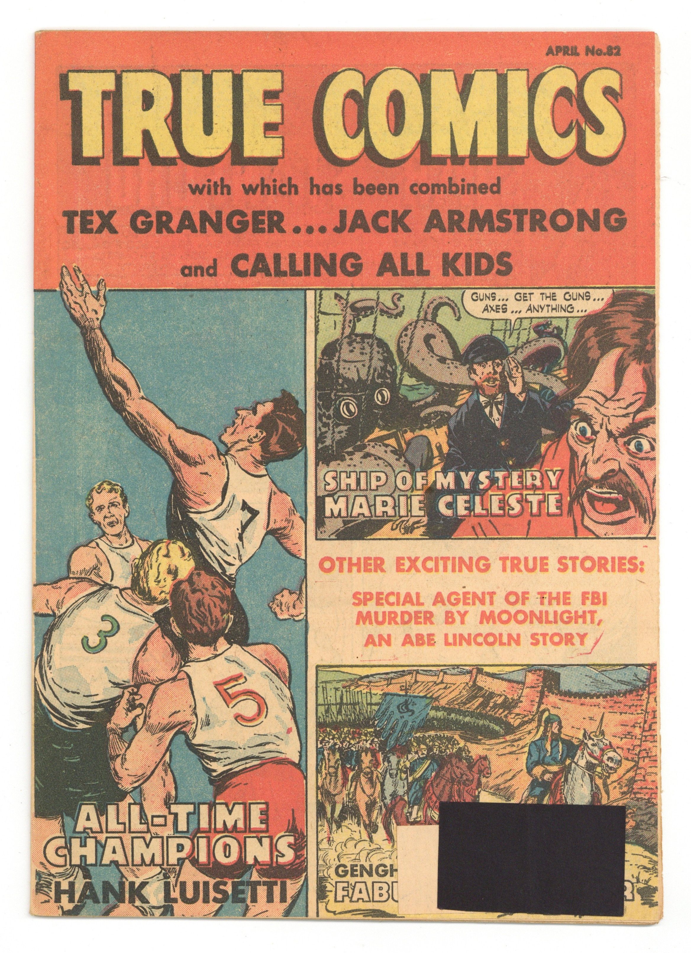 Published Apr 1949 by True Comics Press.$45.50Stories and art by Edd Ashe and others. Biography and history stories in comics form, part of a trend in non-fiction comics in the 1940s. Genghis Khan uses brute force and strategy to conquer vast territory; The Marie Celeste is found adrift with all hands missing, a mystery that was never solved; Attorney Abe Lincoln defends a murder suspect. Star of Stanford: Hank Luisetti; The Mystery of the Marie Celeste; Genghis Khan: Empire Builder; Wolves Can Be Tough; Shotgun Bank Robbers; Abraham Lincoln: Murder by Moonlight; The Truth about Cattle Rustling. 32 pages, Full Color. NOTE: #80-84 are all newsprint editions that were distributed by mail only to subscribers (no newstand distribution). Cover price $0.10.