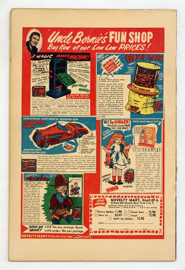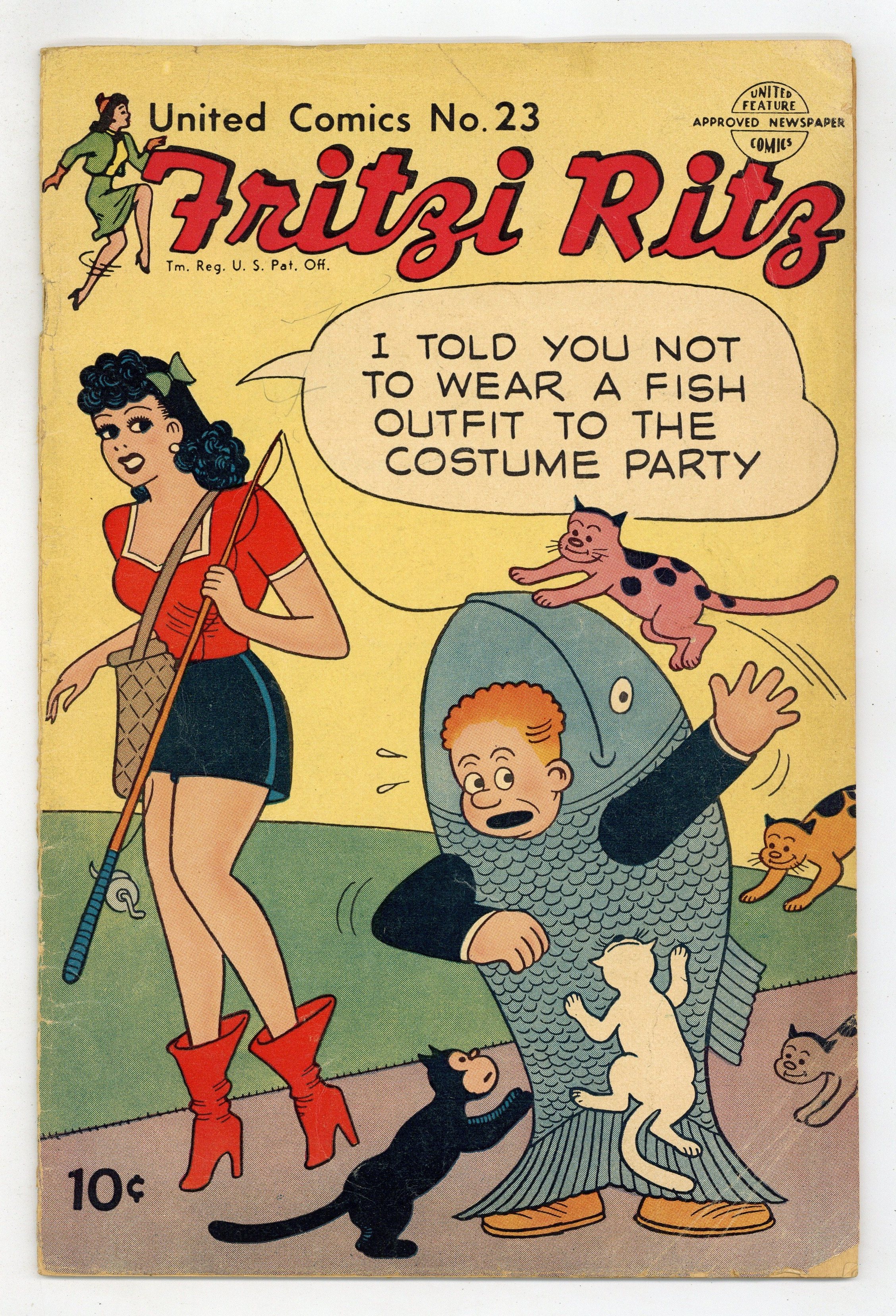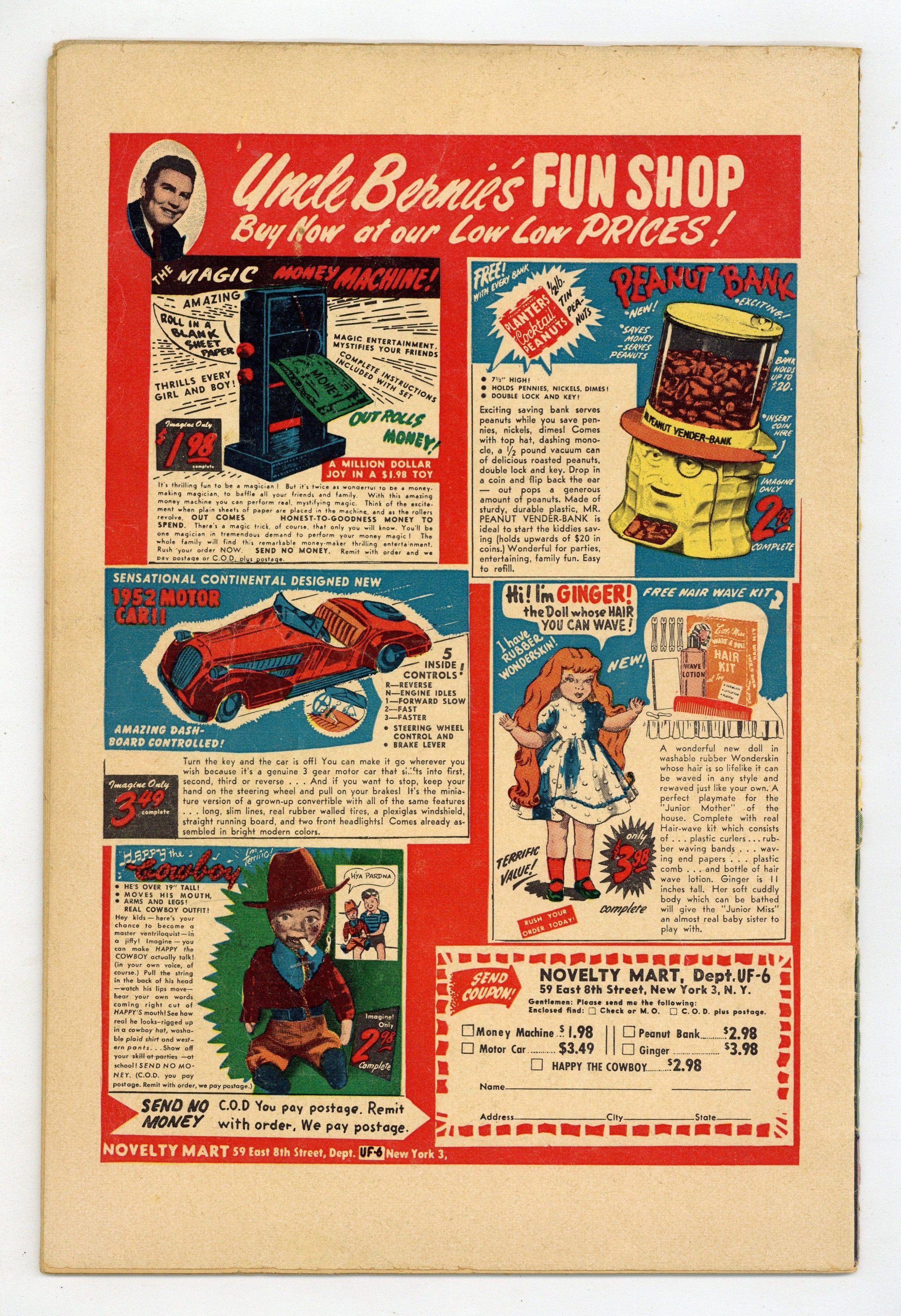 Cover by Ernie Bushmiller. Stories and art by Ernie Bushmiller, Charles Schulz, Russell Patterson, and Raeburn van Buren. The comic-strip adventures of aspiring model Fritzi Ritz and her boyfriend, the bumbling Phil Fumble. Fritzi and Phil fall into a cave that is the secret base of a mad scientist! One of the backup strips in the comic is Charles Schulz's Peanuts, then only in its third year; several daily strips are presented in full color. Bathless Groggins accidentally drinks a formula that will kill him in 30 days, in an Abbie an' Slats strip with art by Raeburn van Buren. Fritzi Ritz; Peanuts; Mamie; Stamp Tips; Abbie an' Slats. 32 pages, Full Color. Cover price $0.10.