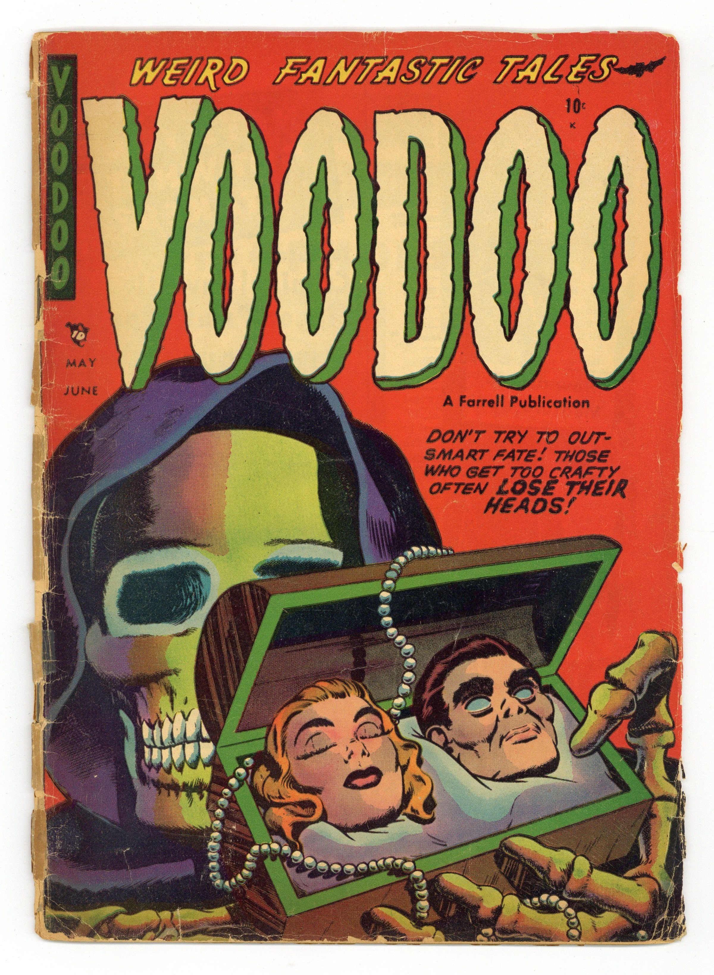 Ajax-Farrell's horror series Voodoo managed to stand out in the crowded field of pre-Code horror comics by dint of its sheer weirdness. An executioner who collects victims' heads meets an ironic fate. A couple discovers a mad scientist's army of giant rats. A frozen cavewoman revived by science goes on a murderous rampage when she gets a glimpse of the modern world. Doomed; Dead Man's Pajamas; Nightmare Island; Witch Magic; Hammer of Evil. 36 pages, Full Color. Cover price $0.10.