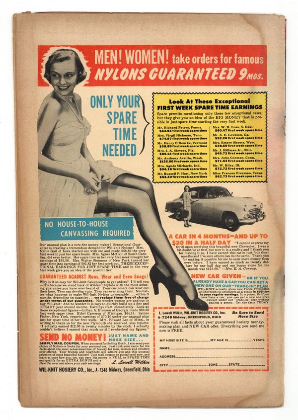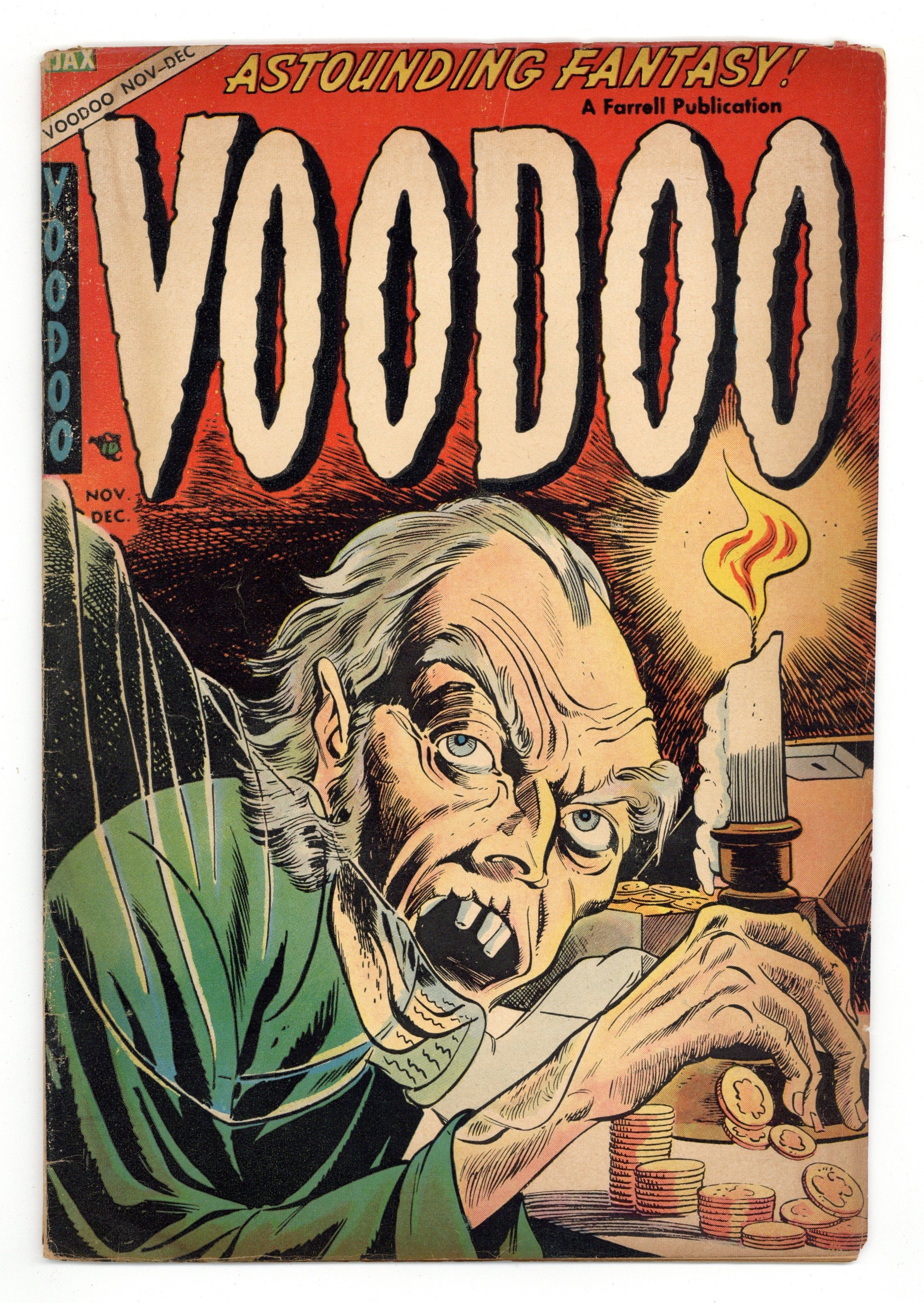 Ajax-Farrell's horror series Voodoo managed to stand out in the crowded field of pre-Code horror comics by dint of its sheer weirdness. An experiment revives a man framed and executed for murder, so he makes the most of his extra hour of life. Female reporter Margie investigates a murder at a fashion show. Visitors to Werewolf Castle are not what they seem. Sound of Mourning; Assignment: Danger; Let Me Die Today; The Deaf Night Watchman; Werewolf Castle. 36 pages, Full Color. Cover price $0.10.