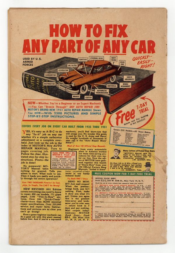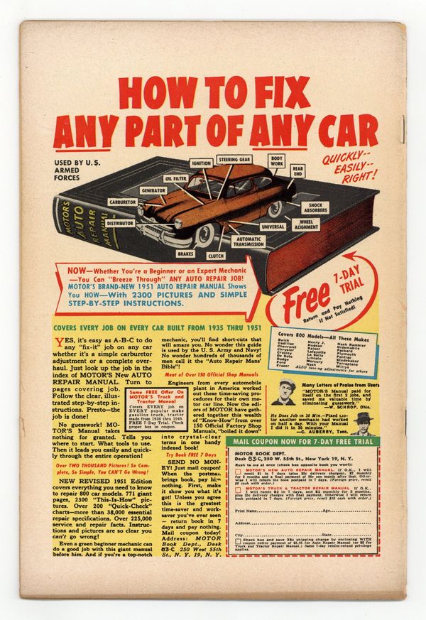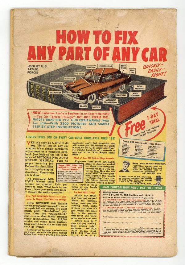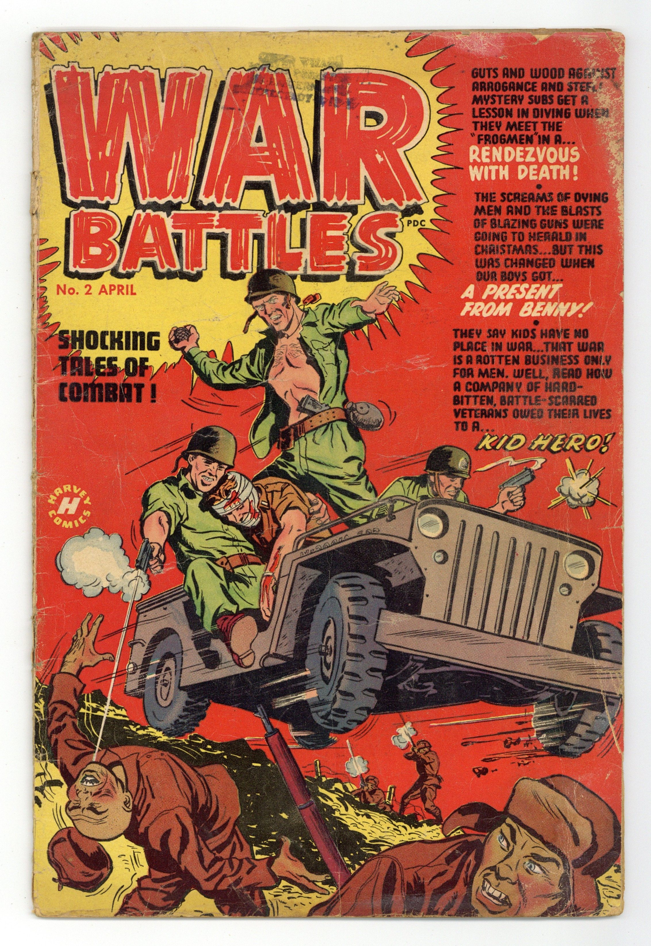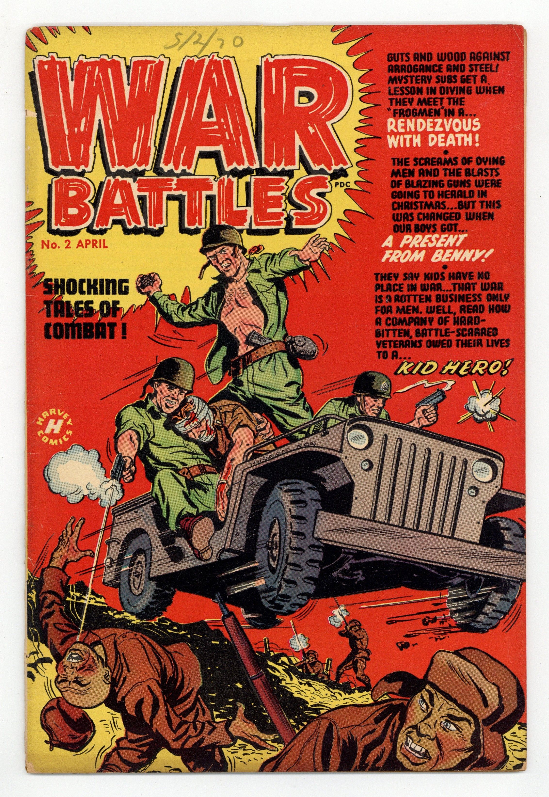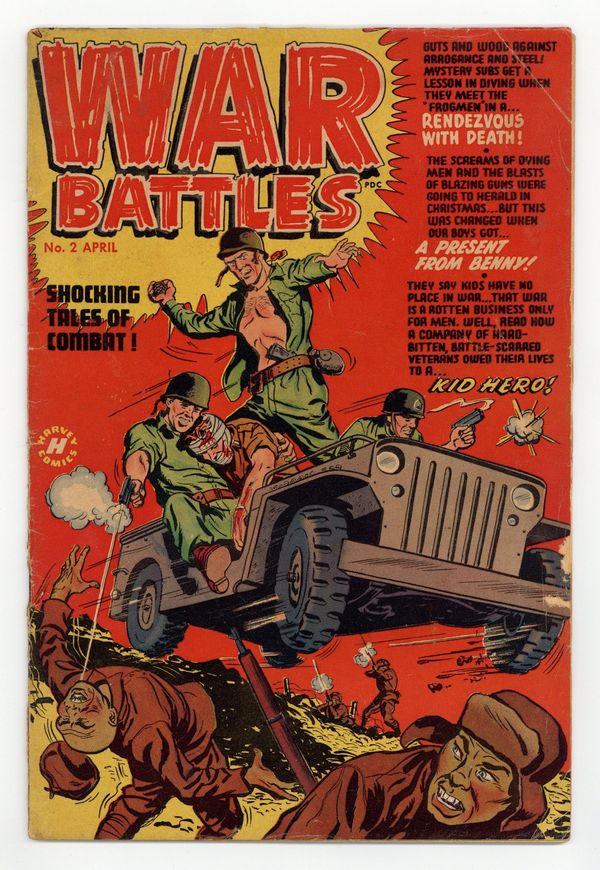 Stories and art by Bob Powell and Jack Sparling. Tales of war from Harvey, published as the Cold War was heating up. Navy frogmen launch an underwater search for mystery submarines. Christmas on the front is a grim ordeal, until the arrival of a present for Benny. A youth becomes a hero to a hard-bitten company of battle-scarred veterans. Rendezvous with Death!; Curtains for Al!; No Man's Land!; Semper Paratus; Honor in Death!; A Present for Benny; Kid Hero; Operation... Blue. 36 pages, full color. Cover price $0.10.