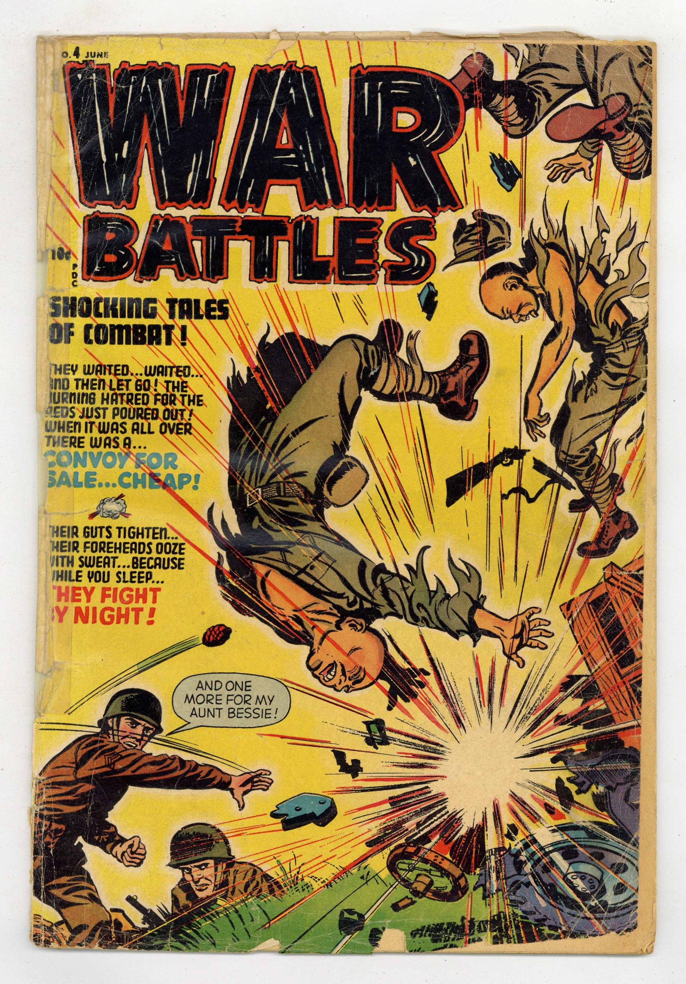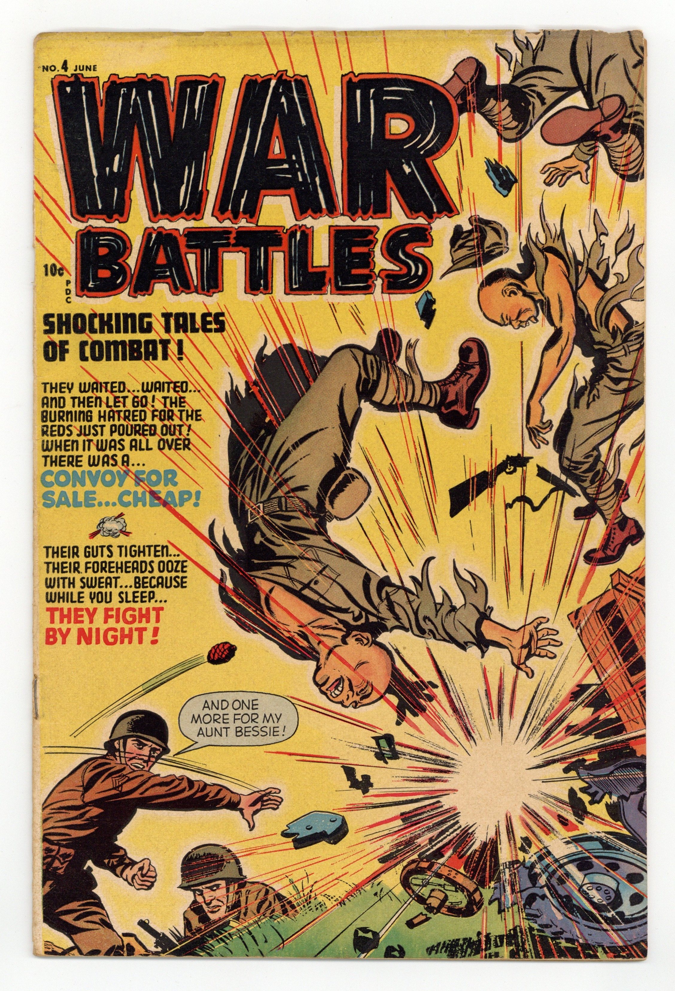 Cover by Al Avison. Stories and art by Warren Kremer, Jack Sparling, Lee Elias, Manny Stallman and Bob Powell. Tales of war from Harvey, published as the Cold War was heating up. Soldiers must take out an enemy convoy. A nighttime battle spells danger for a sleep-deprived platoon. A soldier's life is saved by the Bible he carries in his chest pocket. The Commies Told Me… No Work - No Eat; Convoy for Sale - Cheap!; Tin Can Death!; The Frogmen; They Fight by Night!; Pot Luck; I Owe My Life to My Bluejackets Bible. 36 pages, full color. Cover price $0.10.