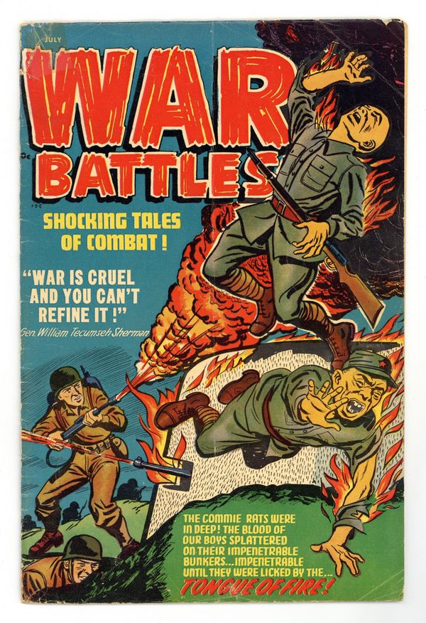 Cover by Al Avison. Stories and art by Jack Sparling and others. Tales of war from Harvey, published as the Cold War was heating up. Communist soldiers are stationed in impenetrable bunkers...until the flamethrower troops arrive. A pilot shot down into freezing waters behind enemy lines knows that he has only minutes to survive. Soldiers are forced to withdraw until they get to the edge of the sea. 20 Minutes to Live!; Tongue of Fire!; Battlegrounds; Nicknames of War; The Immortal Sgt!; The Last Mile; The Same Story; Number's Up. 36 pages, full color. Cover price $0.10.