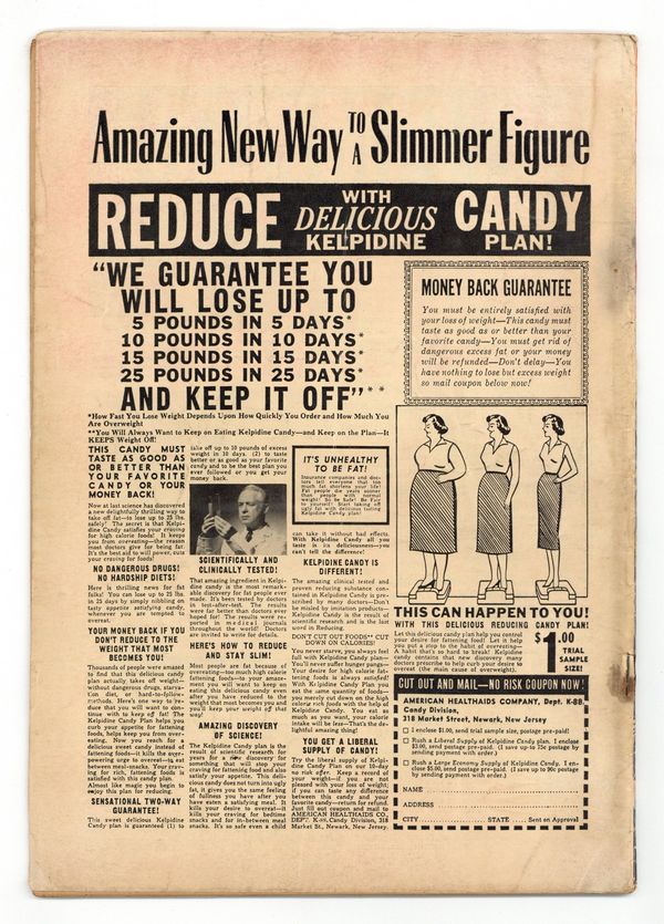 Published 1954 by Ace Comics.$146.00- Only one staple (manufacturing). Cover and centerfold detached. Heavy water damage.