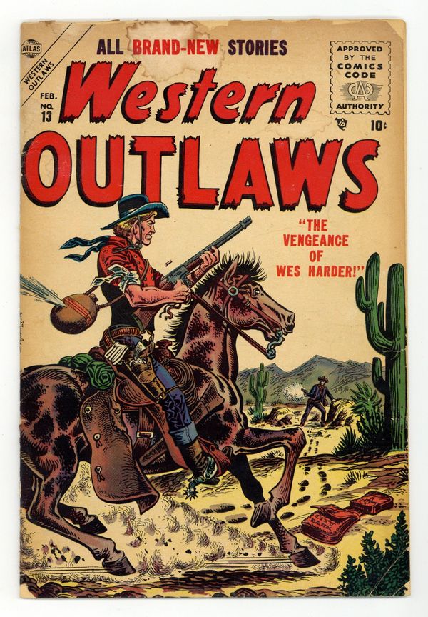 "The Vengeance of Wes Harder!" (script by Stan Lee, art by Matt Baker), "The Desperado!" (script by Lee, art by Jay Scott Pike), "No Place to Hide!" (script by Lee, pencils by Ross Andru, inks by Mike Esposito), "Reward Dead or Alive!" (script by Lee, art by Joe Maneely), and "When the Keegers Rode!" (script by Lee, art by John Romita Sr.). Edited by Stan Lee. Cover by Joe Maneely. Stories by Lee, Baker, Pike, Andru, Esposito, Maneely, and Romita. 36 pages, full color. $0.10. Cover price $0.10.