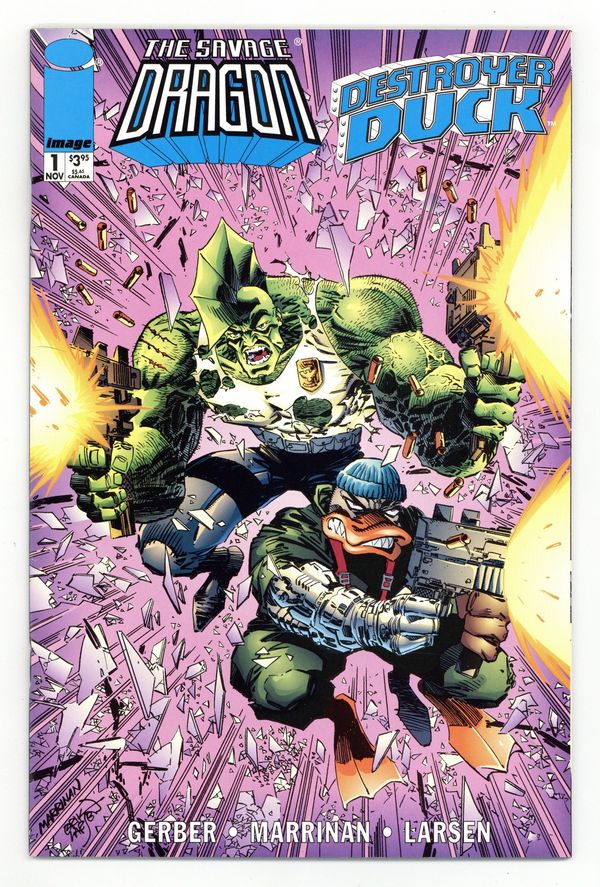 $16.00Three crazed creators! Two classic characters! Together in one mind-blowing team-up the comic book world won't soon forget! Erik Larsen's Fightin' Fin-Head teams up with Steve Gerber's Marauding Mallard to quell a post-modern mob war in the streets of Chicago. Plus, the return of Gregory Brainard and the Industrial Accidents! Super Freak Self-Esteem training! Plus a surprise cameo by a world famous webhead and Cleveland's favorite fowl! Written by Steve Gerber. Art and cover by Chris Marrinan and Erik Larsen. FC, 48 PG. Cover price $3.95.