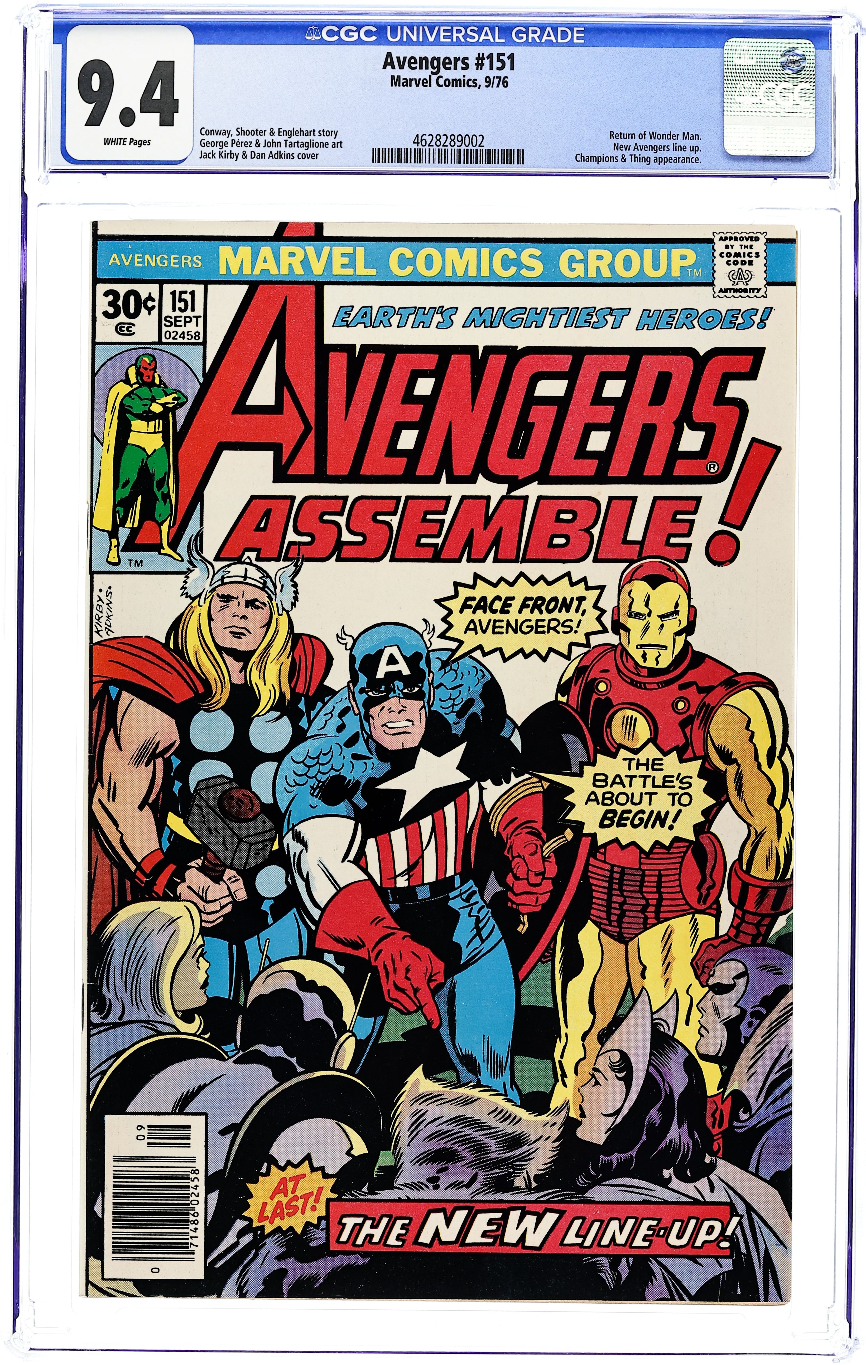 "At Last: The Decision!" Part 2 of 2. Script by Steve Englehart, Gerry Conway, and Jim Shooter. Pencils by George Perez. Inks by John Tartaglione. Cover by Jack Kirby and Dan Adkins. Finally, the Avengers are ready to set their new roster! Iron Man agrees to be chairman! Cap stays! Wanda and the Vision remain with the group! The Wasp eagerly signs up! Yellowjacket first declines but then changes his mind! Moondragon decides to leave, and Hellcat goes with her. The bombastic Beast jubilantly joins! And Wonder Man...hold on, what? How? Wow! Cameo appearances by Robert Frank (aka the golden age Whizzer), the Black Widow, Angel, Ghost Rider, Hercules, Iceman, Ben Grimm, Wonder Man, and the Living Laser. First 30¢ issue. (Notes: This issue concludes Steve Englehart's legendary 4-year run as the writer for Earth's Mightiest Heroes. A time period that produced many of the Avengers' all-time fan favorite stories including the three frequently reprinted sagas: the Avengers-Defenders War, the Celestial Madonna saga, and the Serpent Crown crisis. The letters page contains an essay explaining why the 150th anniversary story ended up as two issues.) 36 pgs. Cover price $0.30.