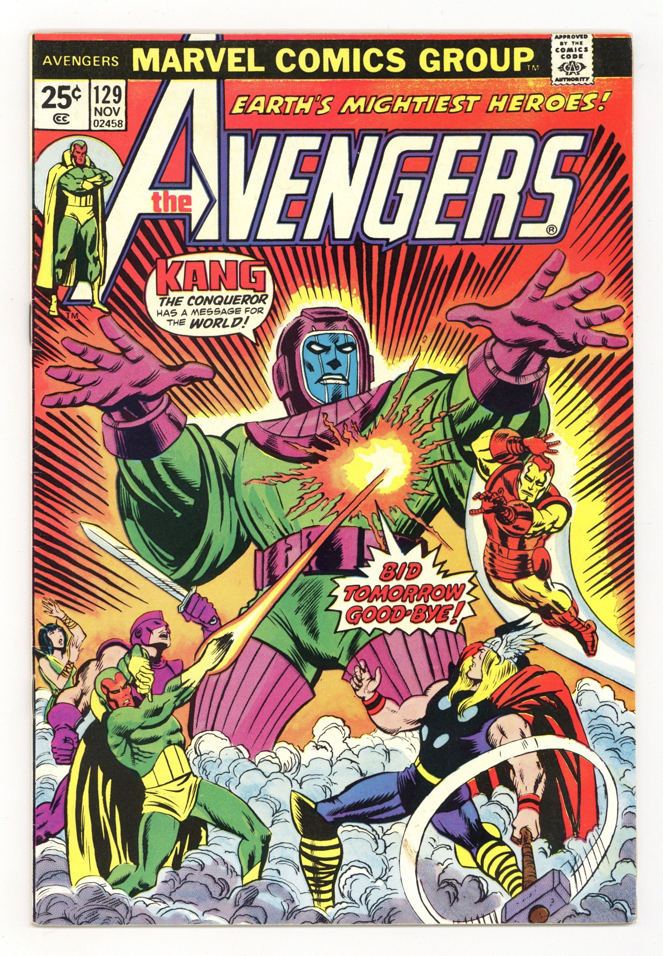 "Bid Tomorrow Goodbye!" Script by Steve Englehart. Art by Sal Buscema (breakdowns) and Joe Staton (finishes). Cover by Ron Wilson and Mike Esposito. A bright shining star appears over Avengers Mansion! What does the radiant beacon foretell? Kang the Conqueror thinks he knows! And thus begins the Celestial Madonna saga! The 41st century Master of Time and his macrobots attack the Avengers outside their mansion! After overwhelming the six avengers, Kang absconds with five of them plus Agatha Harkness! The Conqueror deems the Swordsman as unworthy and leaves him behind. Will Kang end up regretting that decision? The former sword-wielding super-villain certainly has his work cut out for him! However, the Swordsman catches a big break when Agatha Harkness telepathically reveals Kang's hideaway! The centuries-old pyramids of Egypt! After arriving in the Egyptian desert, the Swordsman desperately needs an ally! Could one of the ancient pharaohs still be lurking around to help? Story continues in Giant-Size Avengers 2. Cameo appearance by Rama-Tut. Avengers Lineup: Iron Man, Mantis, Scarlet Witch, Swordsman, Thor, and the Vision. (Notes: The classic Celestial Madonna storyline runs through Avengers 129-135 and Giant-Size Avengers 2-4. Kang previously battled Earth's Mightiest Heroes in Avengers (1st series) 71. The letters page contains Marvel Value Stamp Series A #88 The Leader.) 36 pages Cover price $0.25.