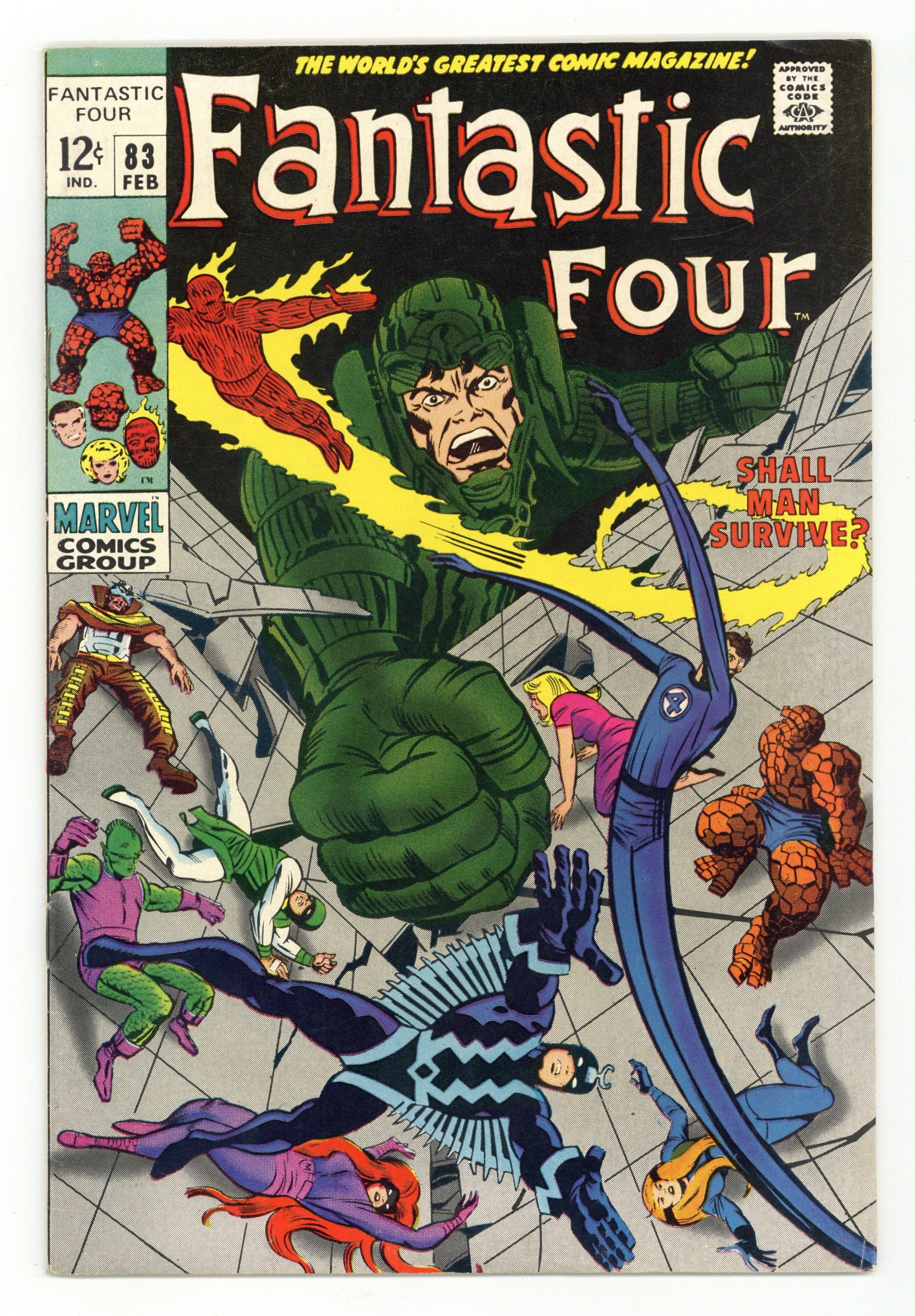 "Shall Man Survive?" Part 2 of 2. Guest-starring the Inhumans. Script by Stan Lee. Pencils by Jack Kirby. Inks by Joe Sinnott. Cover by Jack Kirby and Joe Sinnott. Maximus the Mad has conquered Attilan! And his next target is the entire planet! With the Fantastic Four and the Inhumans as his captives, Black Bolt's crazy brother is on the brink of world domination thanks to his powerful hypno-gun! But the Inhumans still have one card to play! Black Bolt's awesome voice! His booming voice could free the royal family from its prison! Or destroy the whole city! Likewise in a nearby chamber, the FF work feverishly to escape from their confinement! If both super-teams can break out, they'll have a chance to break up Maximus' mad plan of conquest! Cameo appearances by the Invisible Girl and (baby) Franklin. Inhumans Lineup: Black Bolt, Gorgon, Karnak, Medusa, and Triton. (Notes: This issue is the second appearance of Franklin Richards. Although the Invisible Girl appears on the cover, she is not in Attilan for the battle. Maximus returns in Incredible Hulk 119. The Inhumans appear next in Silver Surfer (1st series) 18. This issue includes a full-page ad for Avengers 60 and Amazing Spider-Man 69. This two-part story was reprinted in Marvel's Greatest Comics 64 & 65) 36 pages Cover price $0.12.