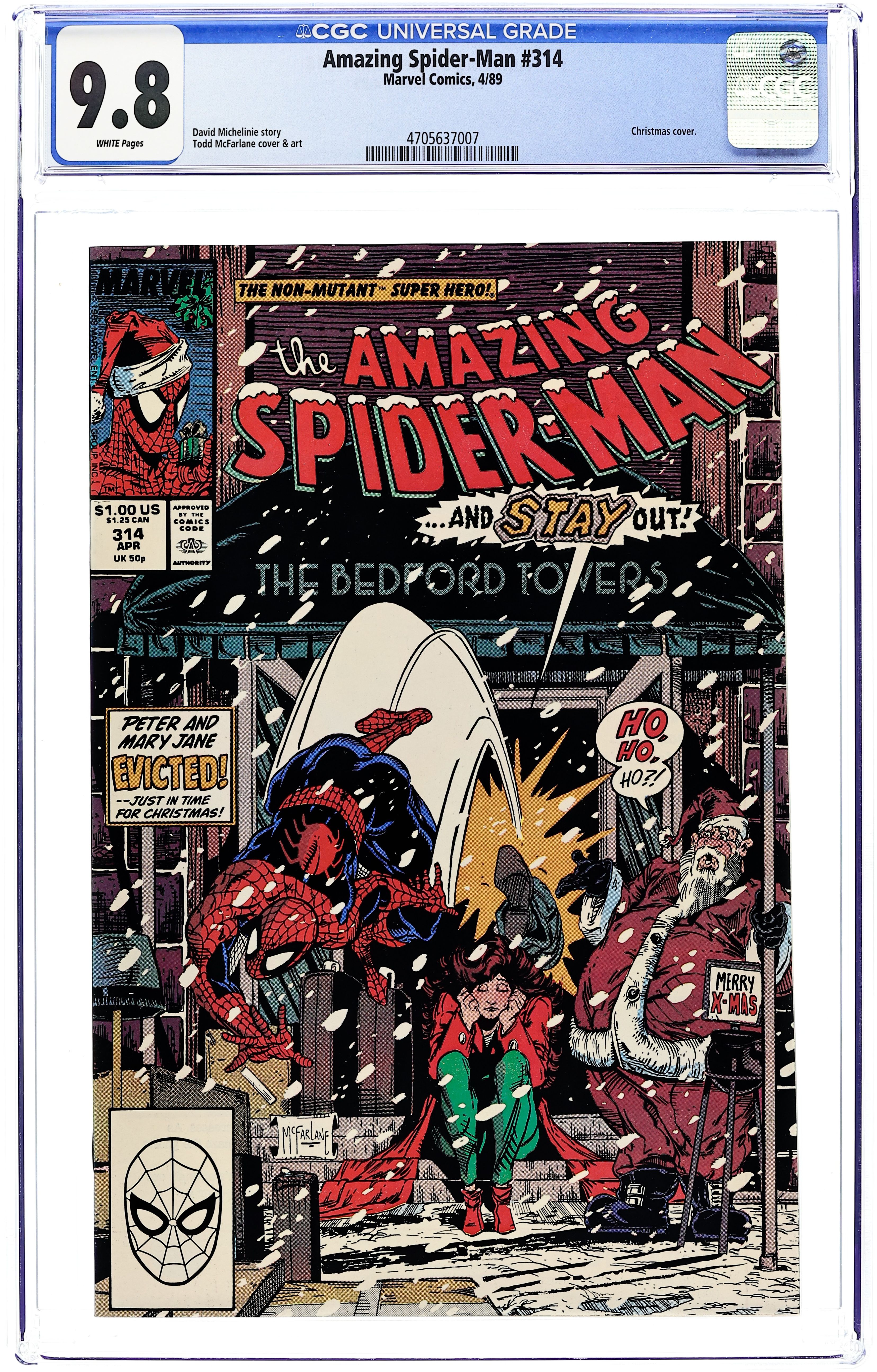 Direct Edition. "Down and Out in Forest Hills" Script by David Michelinie. Art by Todd McFarlane. Cover by Todd McFarlane. In a cold-blooded move from his prison cell, Jonathon Caesar evicts Peter and Mary Jane from their Bedford Towers condo just in time for Christmas! And now the Parkers have to find a new place to live ASAP! One option is to move back in with Aunt May in Forest Hills! However the famous American novelist Thomas Wolfe once said: "You can't go back home again." Where will the Amazing Spider-Man and his wife decide to live? A heartwarming story. Cameo appearances by J. Jonah Jameson, Joe Robertson, Kristy Watson, and Flash Thompson. (Note: The letters page includes a letter from Topps comics publisher Charles Novinskie.) 36 pages. Cover price $1.00.