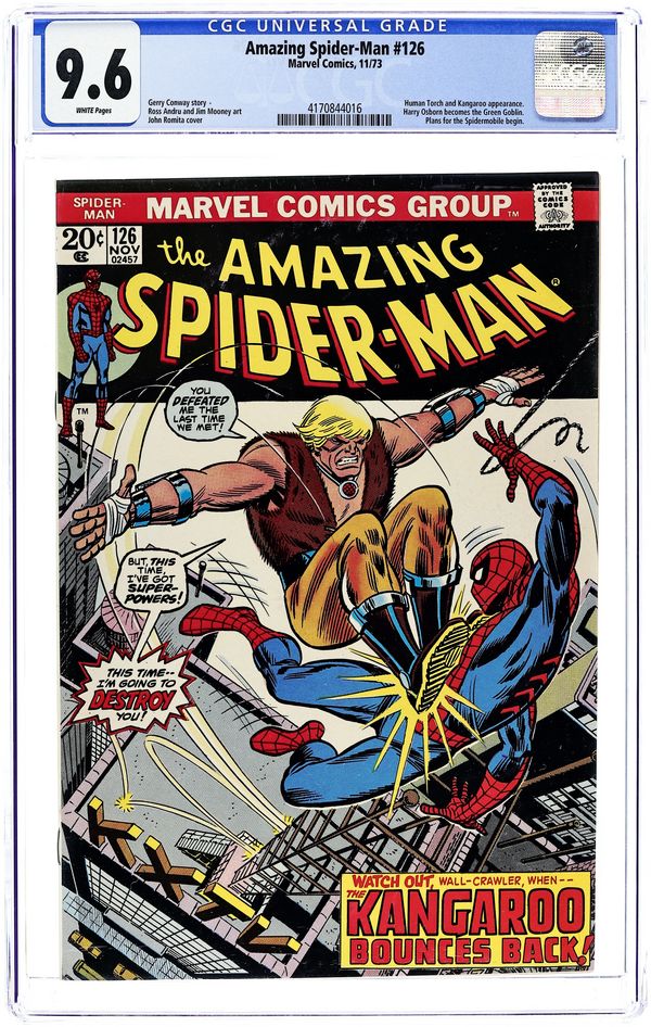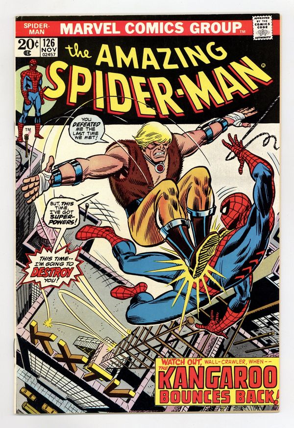 Tags: Marvel Legacy Numbering: Amazing Spider-Man (part 126), Spider-Man$29.00"The Kangaroo Bounces Back!" Script by Gerry Conway. Pencils by Ross Andru. Inks by Jim Mooney. Cover by John Romita. On a rooftop near the Empire State University campus, two advertising executives call out to Spider-Man! Surprisingly, they want the web-slinger to be the spokesman for a new car! At first Spidey declines, but later he changes his mind -- even though he must design the car himself. So it's time to pay a visit to Johnny Storm (aka the Human Torch) for help! Meanwhile, the Kangaroo is back in town. And after receiving a power boost from the creepy Dr. Jonas Harrow, he clashes with the wall-crawler at the Hudson Nuclear Laboratories! Beware of the radioactive isotopes! Lastly, Harry Osborn accepts his family legacy and assumes the mantle of the Green Goblin! Cameo appearances by Aunt May, Mary Jane Watson, Flash Thompson, Professor Miles Warren, John Jameson, Kristine Saunders, and J. Jonah Jameson. (Notes: The Kangaroo previously appeared in Amazing Spiderman #81. This story was reprinted in Marvel Tales 103.) 32 pages. Cover price $0.20.