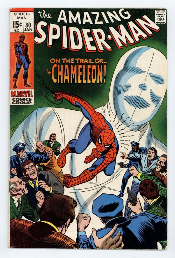 Tags: Marvel Legacy Numbering: Amazing Spider-Man (part 80), Spider-Man$42.50"On the Trail of the Chameleon!" Script by Stan Lee. Art by John Buscema (layouts) and Jim Mooney (finishes). Cover by John Romita. Peter Parker and Gwen Stacy meet for a date at the Midtown Museum to see its new exhibit of priceless paintings. And also at the museum is Gwen's father...who is in charge of security for the evening. So when the paintings are shockingly stolen, Captain Stacy gets blamed for the theft! Peter knows the trusted police captain would never do that. So who did? Ultimately, the web-slinger remembers the name of the Chameleon...and sets a trap for the master of disguise! However the Chameleon is crafty, and he eludes Spider-Man's trap -- until the faceless villain makes a very big mistake! Cameo appearances by Flash Thompson, Harry Osborn, J. Jonah Jameson, and Joe Robertson. (Notes: The wall-crawler previously encountered the Chameleon in Amazing Spider-Man (1st series) #15. This story was reprinted in Marvel Tales #61.) 36 pages. Cover price $0.15.